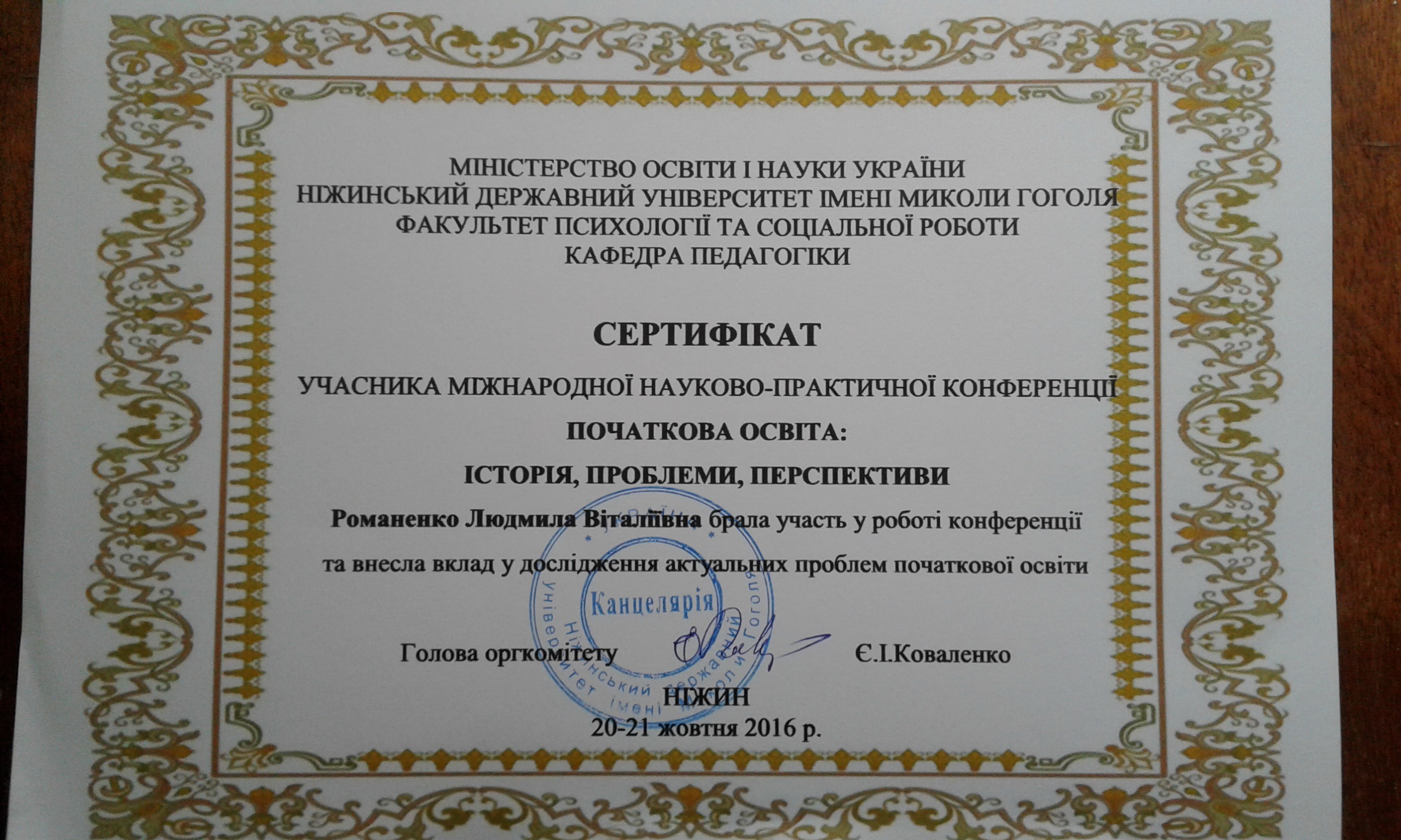 | 7051 | II Міжнародна наукова конференція «Trends in the scientific development» | Переваги застосування планшету GEOBOARD на уроках математики у 1 класі | Vancouver, Canada |