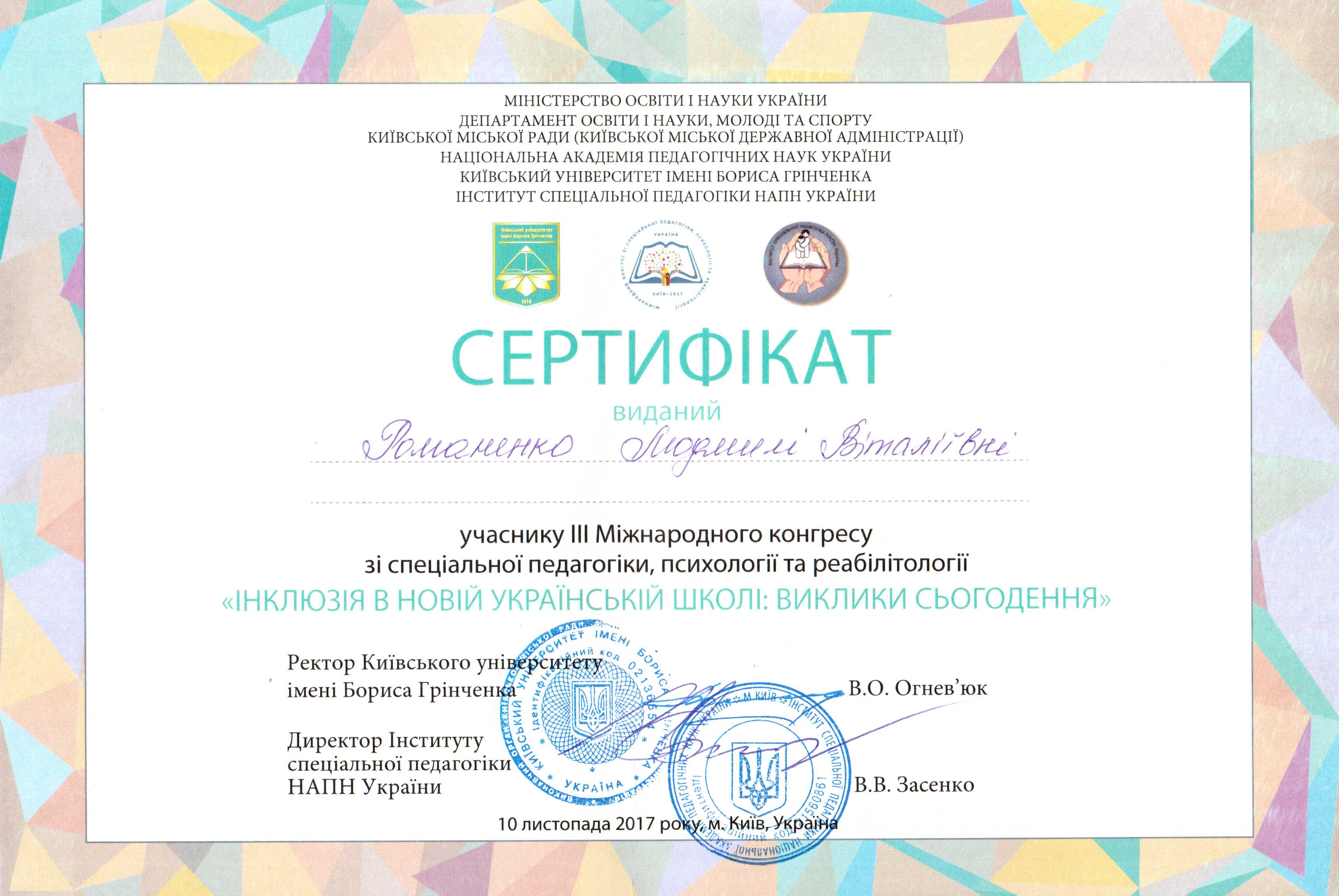 | 1250 | Інклюзія в новій українській школі: виклики сьогодення | ІІІ Міжнародний конгрес зі спеціальної педагогіки, психології та реабілітології | Київський університет імені Бориса Грінченка | 10.11.2017 00:00 | 10 |
