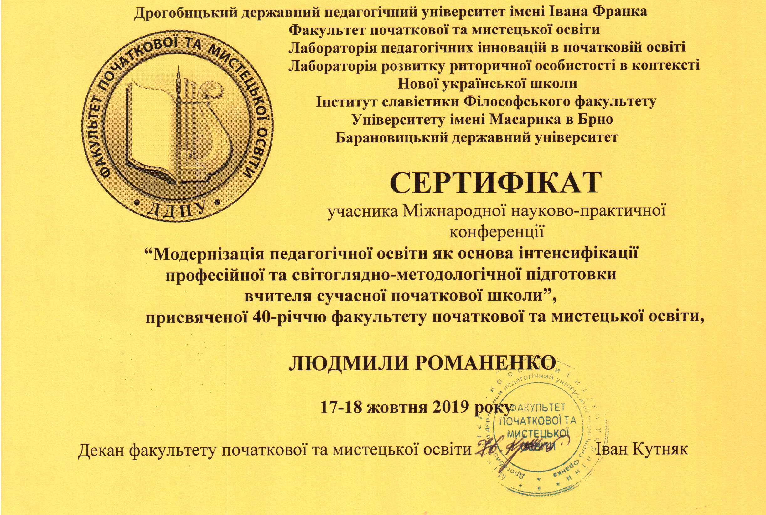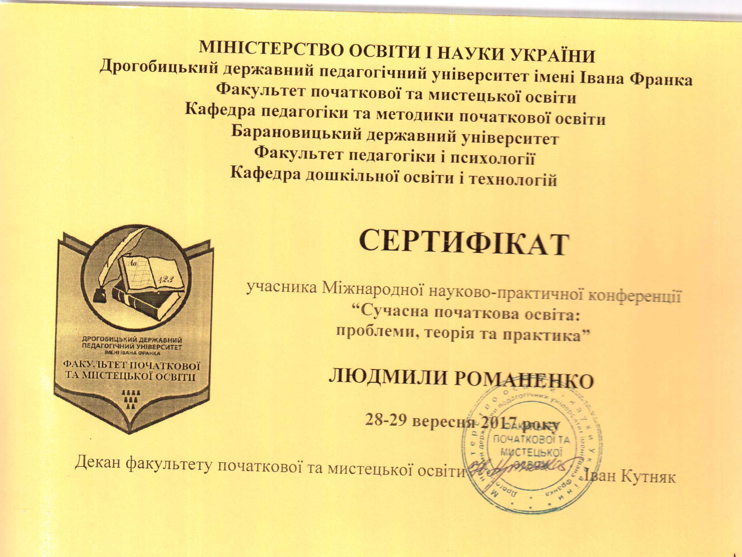 | 2132 | Міжнародна науково-практична конференція "Сучасна початкова освіта: проблеми, теорія та практика" | Методичні особливості валеологічного супроводу уроків математики в початковій школі | Дрогобицький державний педагогічний університет імені Івана Франка |