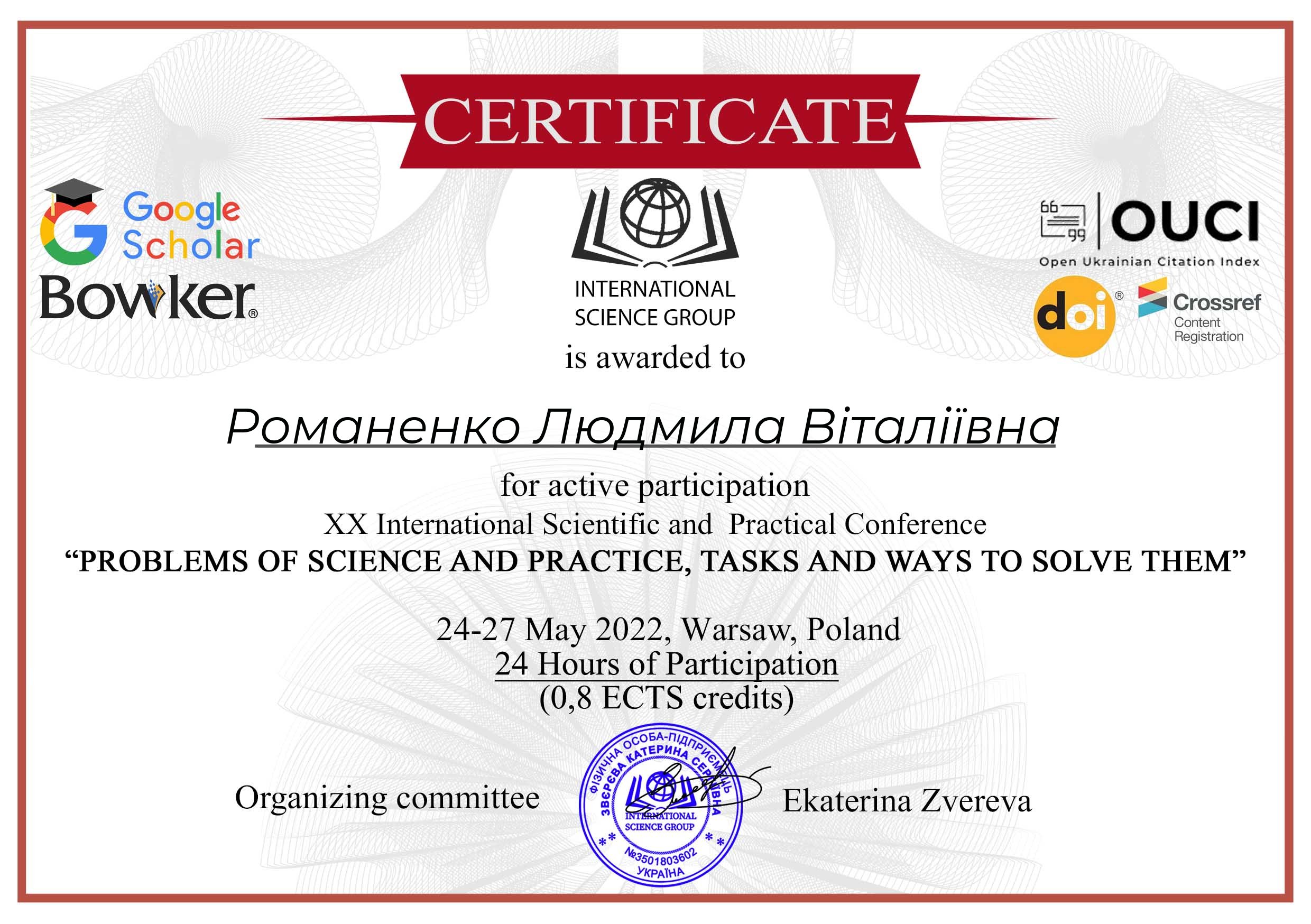 | 8047 | XX International Scientific and Practical Conference «Problems of science and practice, tasks and ways to solve them» | ОРГАНІЗАЦІЯ ФОРМУВАЛЬНОГО ОЦІНЮВАННЯ УЧНІВ У НОВІЙ УКРАЇНСЬКІЙ ШКОЛІ ЯК НАУКОВА ПРОБЛЕМА | Warsaw, Poland |