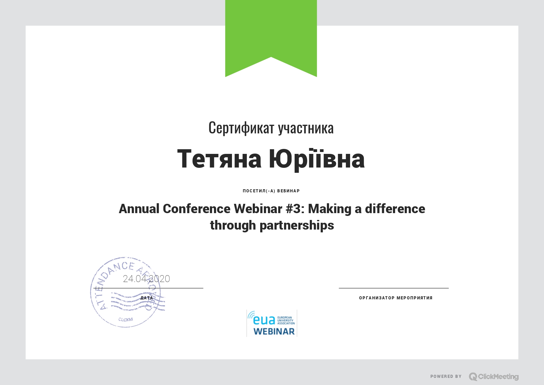 | 5283 | Вебінар "Annual Conference Webinar #3: Making a difference through partnerships" | - | Брюсель |