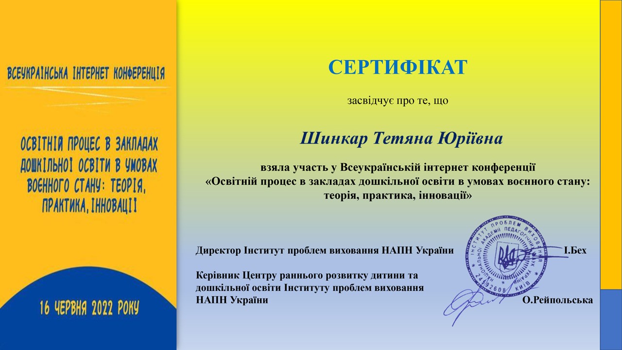 | 9576 | Всеукраїнський круглий стіл «Сучасний заклад дошкільної освіти: лідерство, диджиталізація, майбутній капітал» | учасник | м.Київ |
