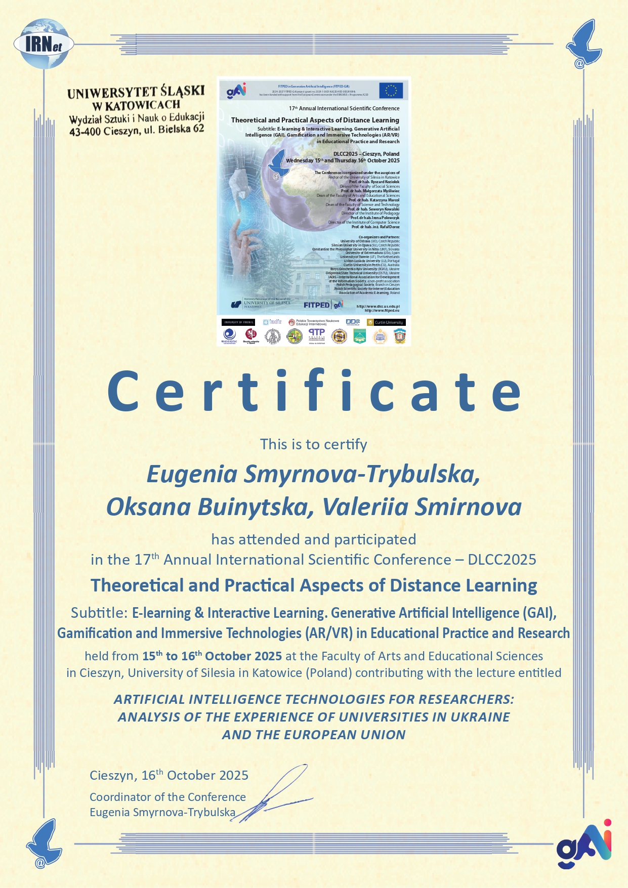 | 13032 | Theoretical and Practical Aspects of Distance Learning (DLCC2025) | Artificial Intelligence Technologies for Researchers: Analysis of The Experience of Universities in Ukraine and the European Union | Cieszyn, Poland |