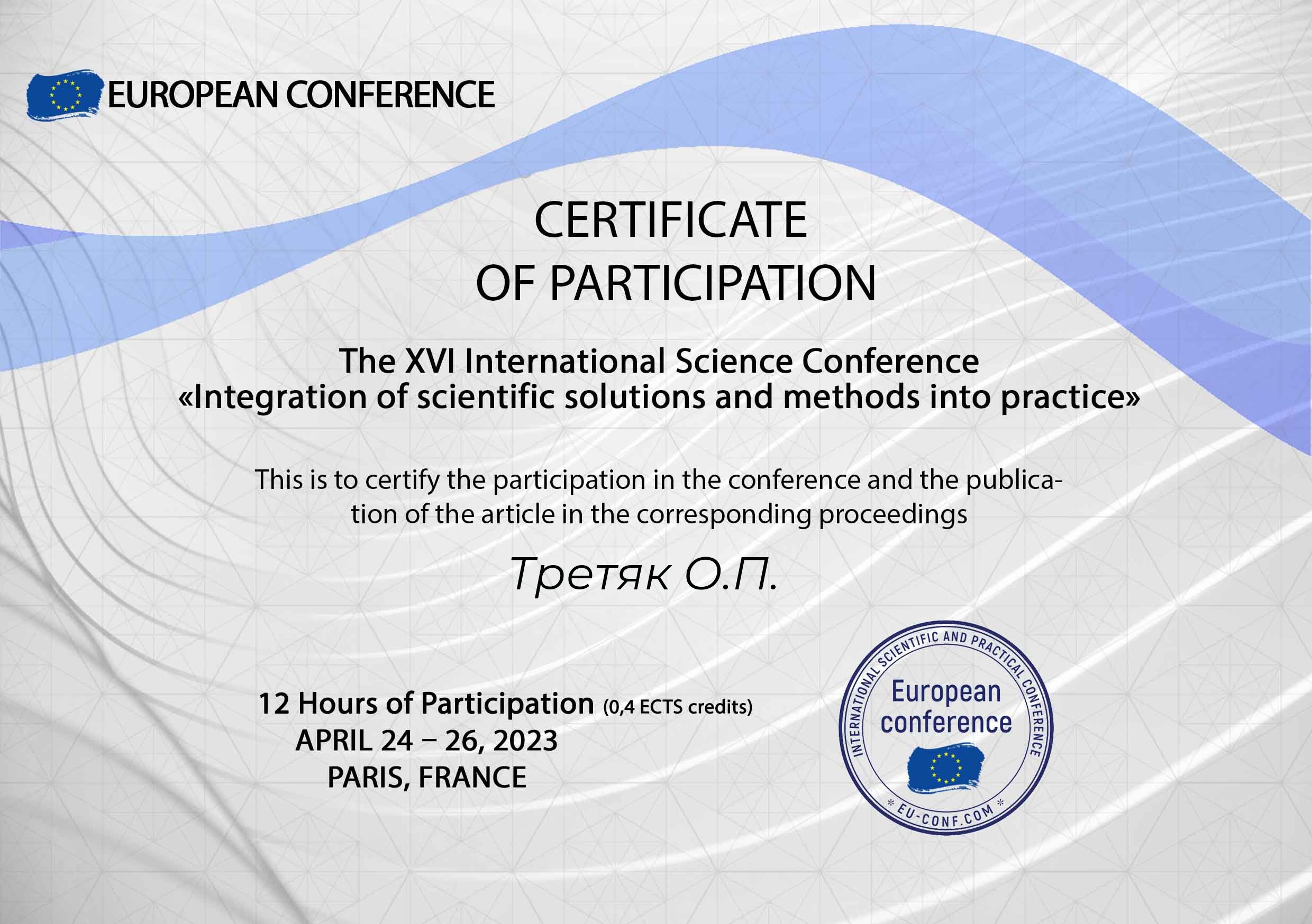 | 10001 | The XVI International Science Conference "Integrationc of scientific solutionc and methods into practice" | Співдружність сердець заради успіху дітей | Paris, France |