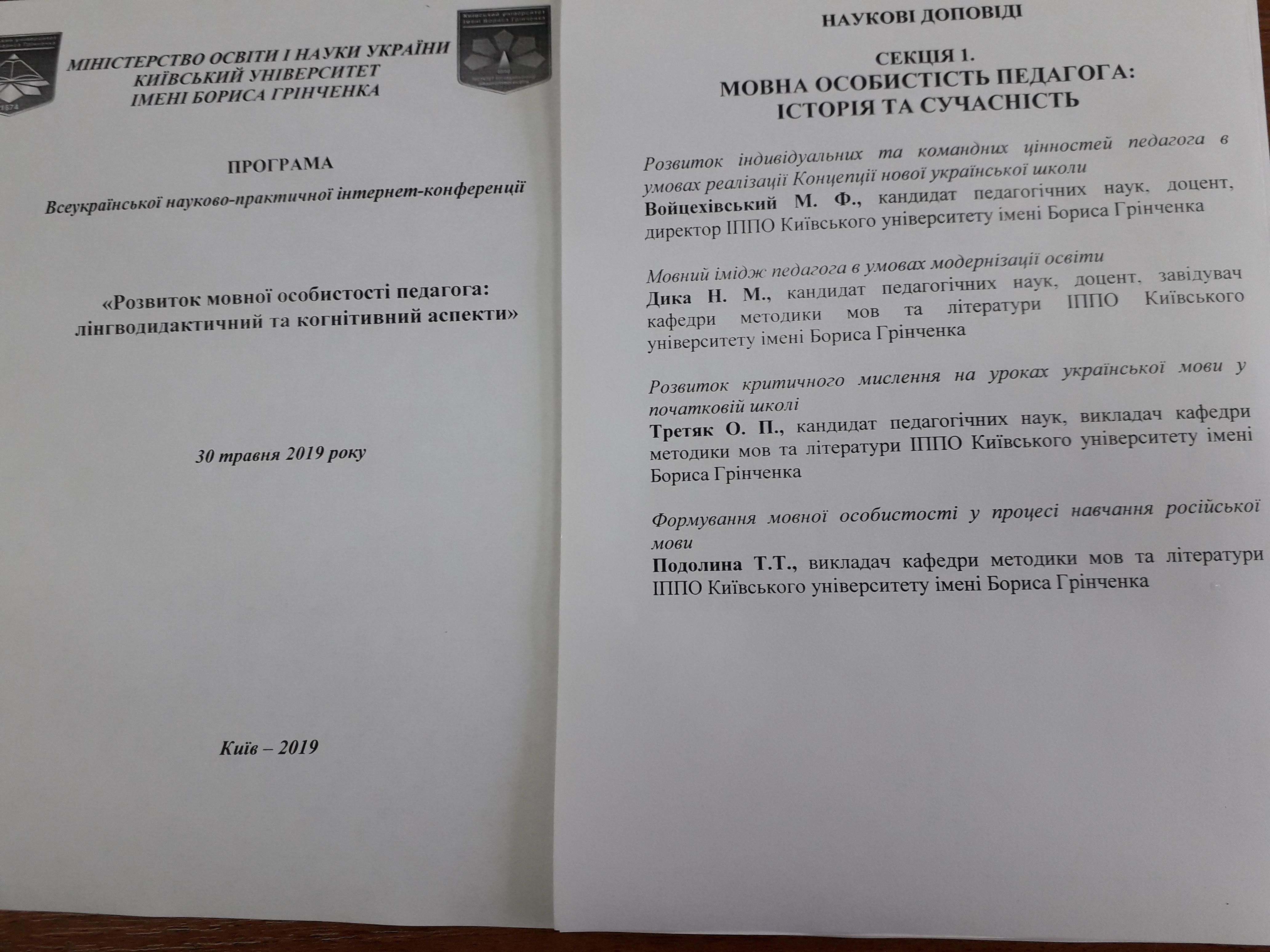 | 5686 | Всеукраїнська науково-практична конференція «ТЕХНОЛОГІЇ ФОРМУВАННЯ ПОЗИТИВНОЇ ГРОМАДСЬКОЇ ДУМКИ ЩОДО ОСВІТНІХ ІННОВАЦІЙ», | Виховання у молодших школярів ціннісного ставлення до навколишнього світу | м. Київ Україна | document.pdf | |