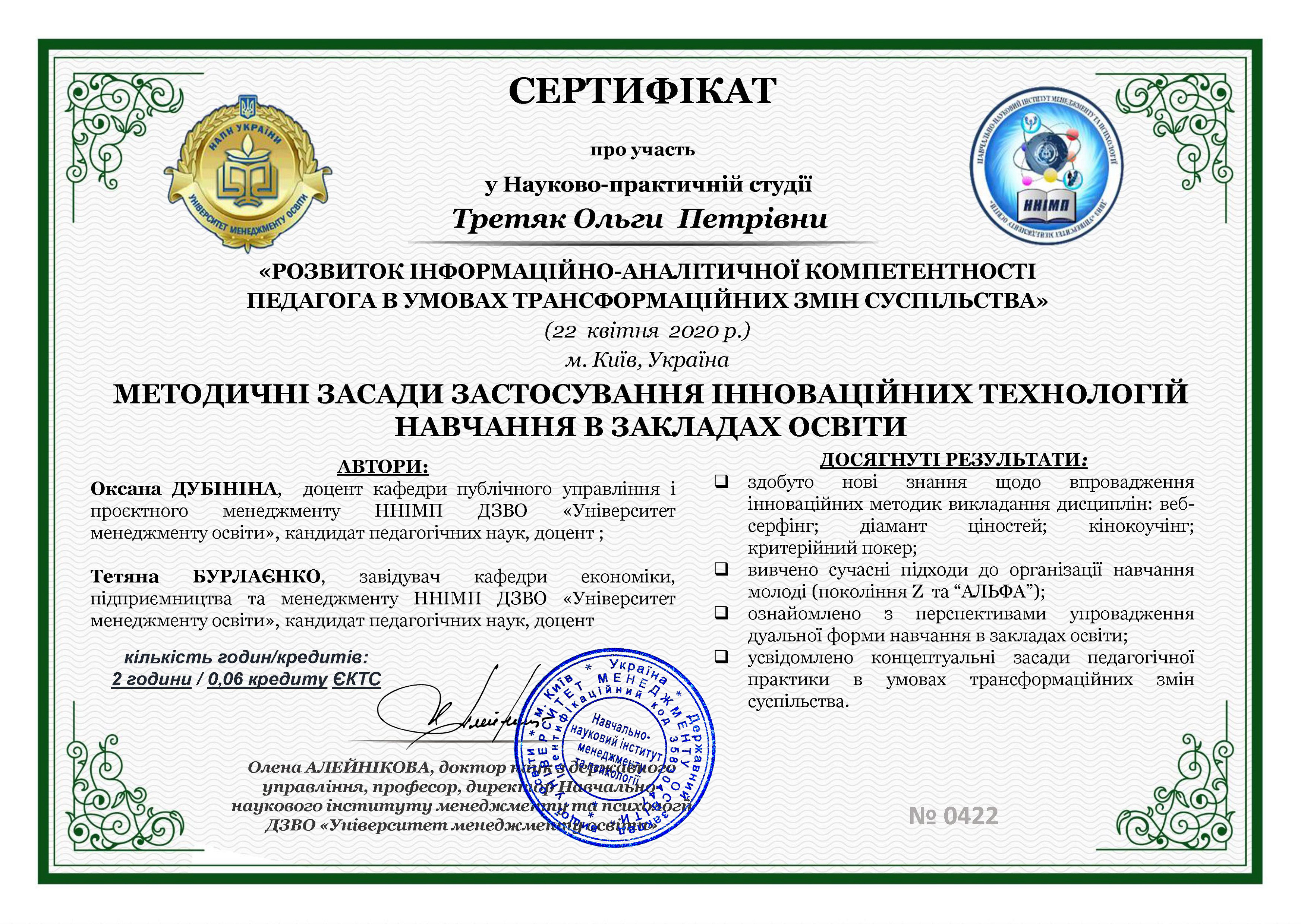 | 5677 | Розвиток інформаційно-аналітичної компетентності педагога в умовах транформаційних змін суспільства | Інноваційні технології навчання в Новій українській школім | м. Київ Україна |