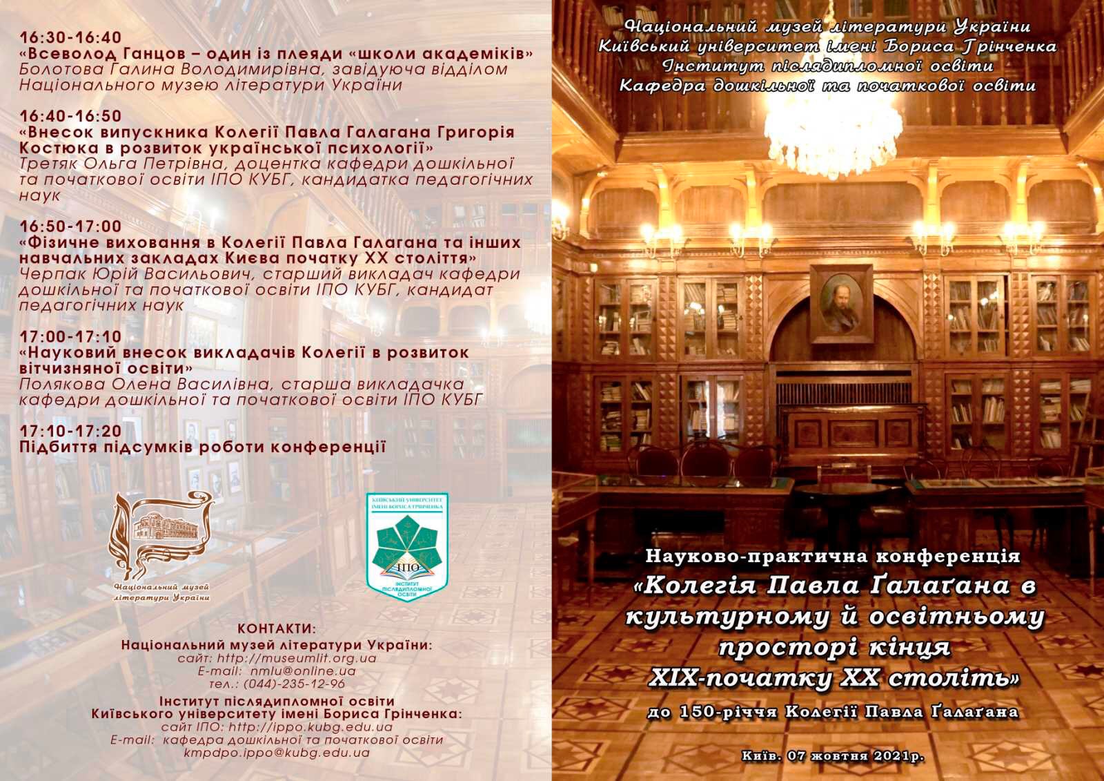 | 7105 | Колегія Павла Галагана в культурному й освітньому просторі кінця ХІХ – початку ХХ століть (до 150-річчя Колегії Павла Галагана) | Внесок випускника Колегії Павла Галагана Григорія Костюка у розвиток української психології | м. Київ Національний музей літератури України |