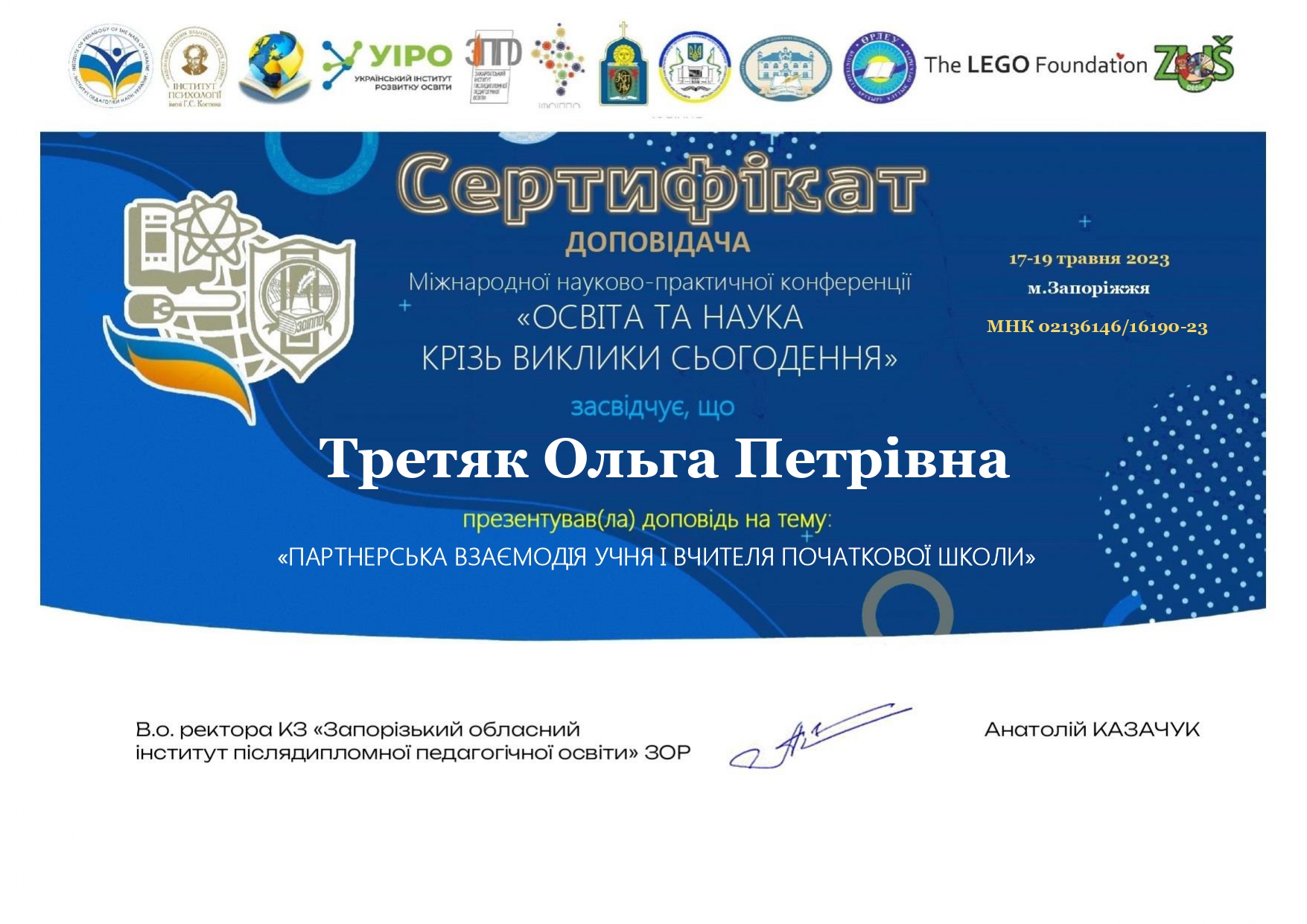 | 9281 | "Освіта та наука крізь виклики сьогодення" | Партнерська взаємодія учня і вчителя початкової школи | м. Запоріжжя |