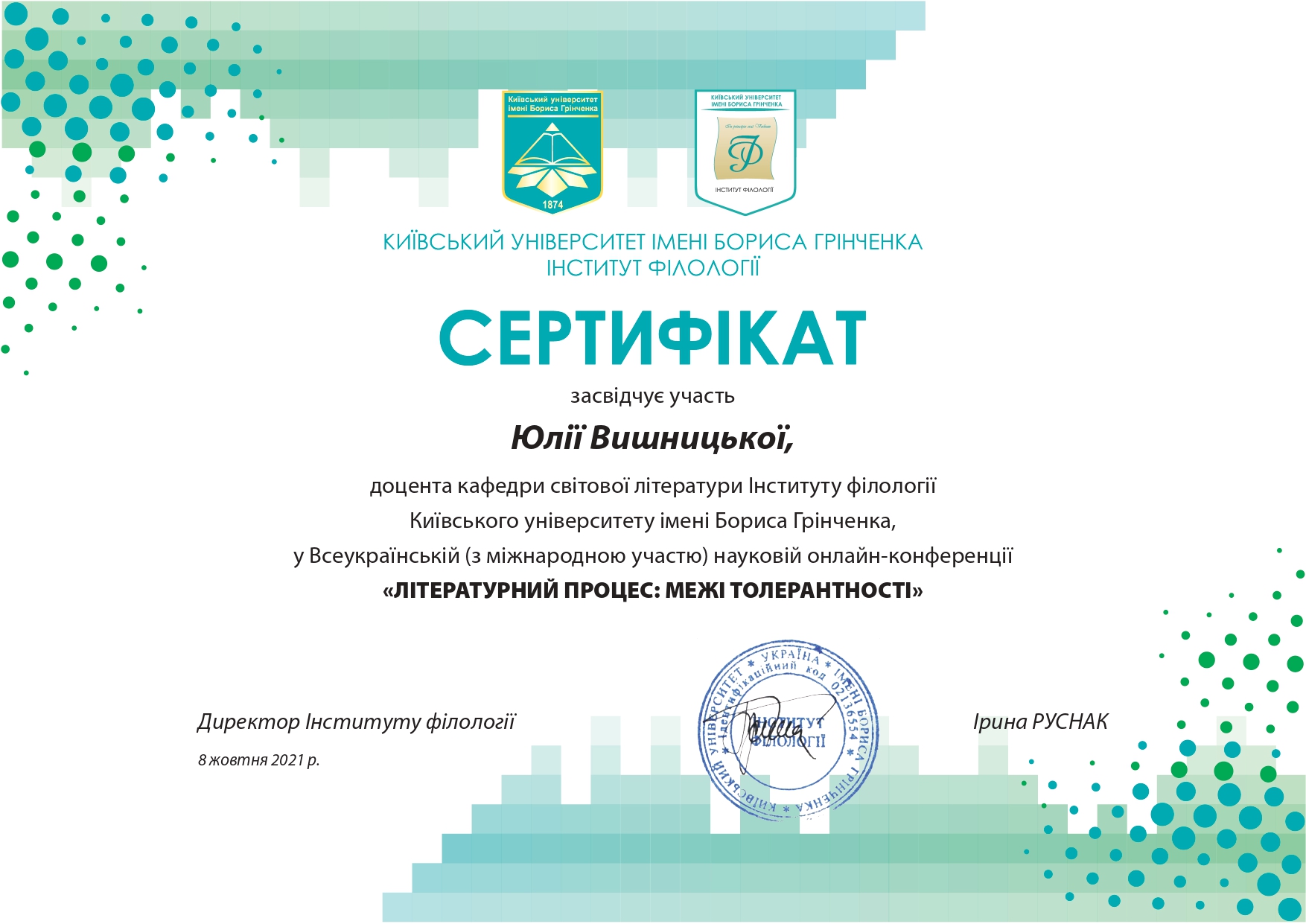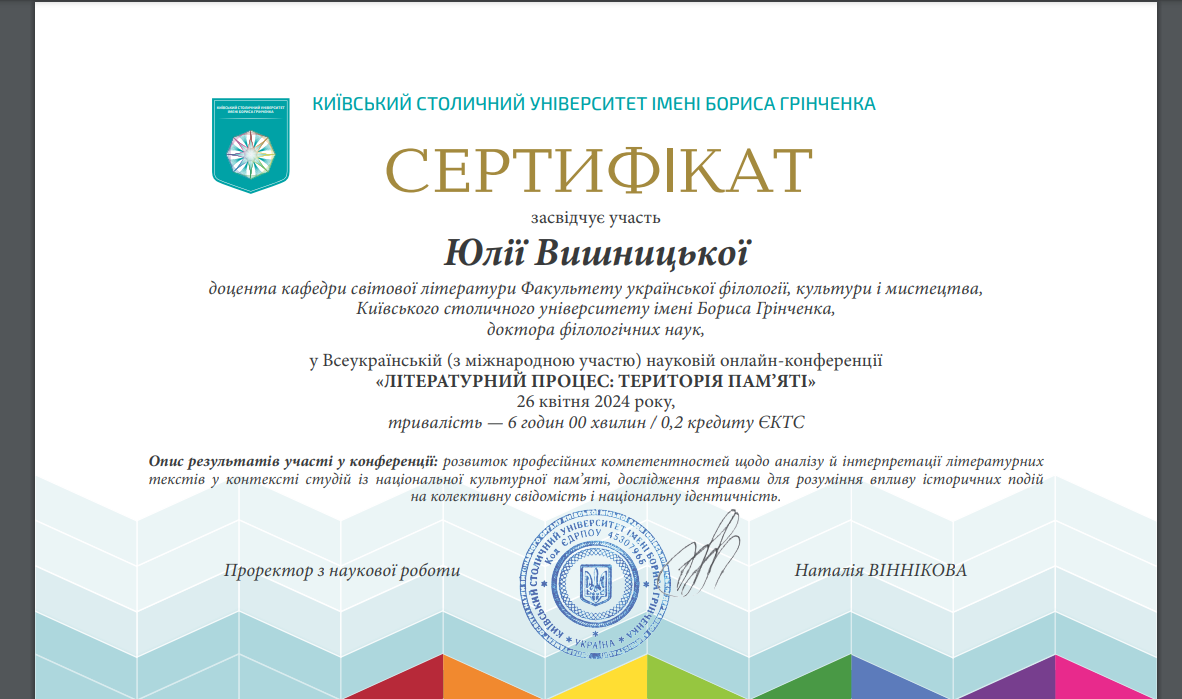 | 11228 | Всеукраїнська (з міжнародною участю) наукова онлайн-конференція «ЛІТЕРАТУРНИЙ ПРОЦЕС: ТЕРИТОРІЯ ПАМ’ЯТІ» | Семіотика часу в поезіях Юрія Руфа | Київський столичний університет імені Бориса Грінченка |