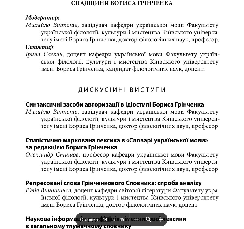| 11229 | Всеукраїнська наукова онлайн-конференція «ЕПОХА ГРІНЧЕНКА: ПРОСВІТА, НАЦІЯ, ІДЕНТИЧНІСТЬ» (XVI щорічні Грінченківські читання) | Репресовані слова Грінченкового Словника: спроба аналізу | Київський столичний університет імені Бориса Грінченка |