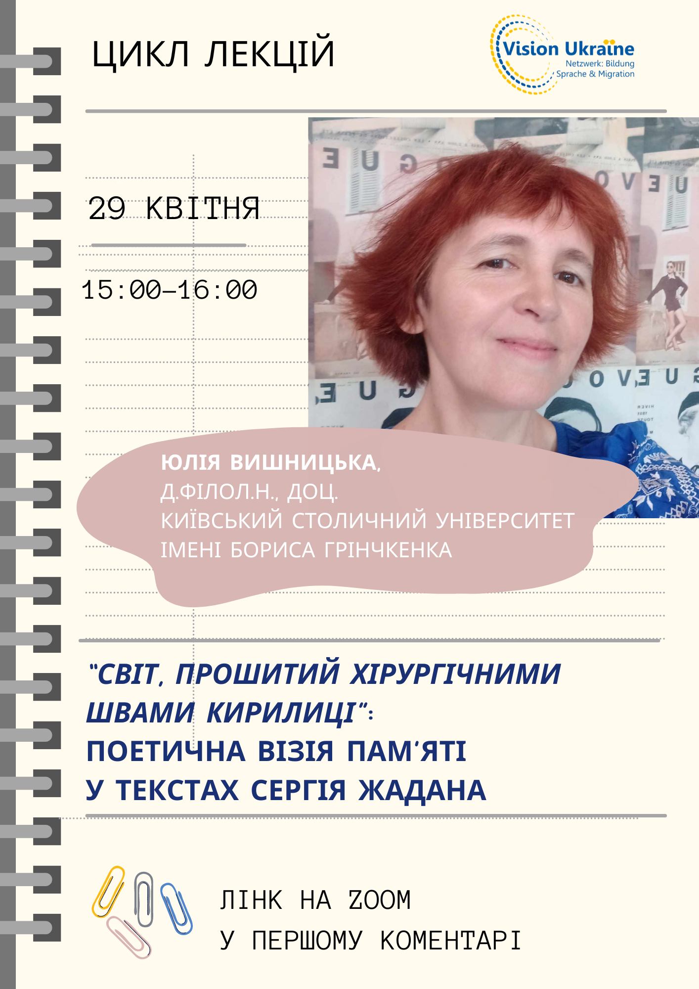 | 11230 | Vision Ukraїne. Netzwerk: Bildung, Sprache & Migration | Світ, прошитий хірургічними швами кирилиці»: поетична візія пам’яті у текстах Сергія Жадана | https://vision-ukraine.de/ |