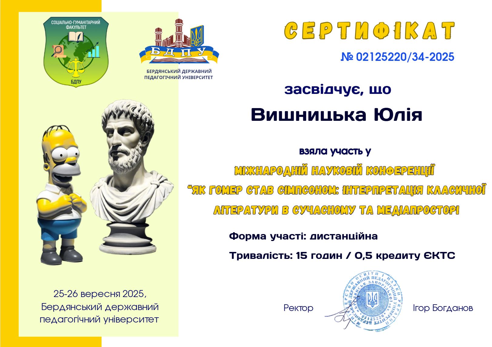 | 12329 | Міжнародна наукова конференція \ | Ідіостильові варіації сліпоти у творах Генріка Ібсена та Жозе Сарамаґо | Бердянський державний педагогічний університет |
