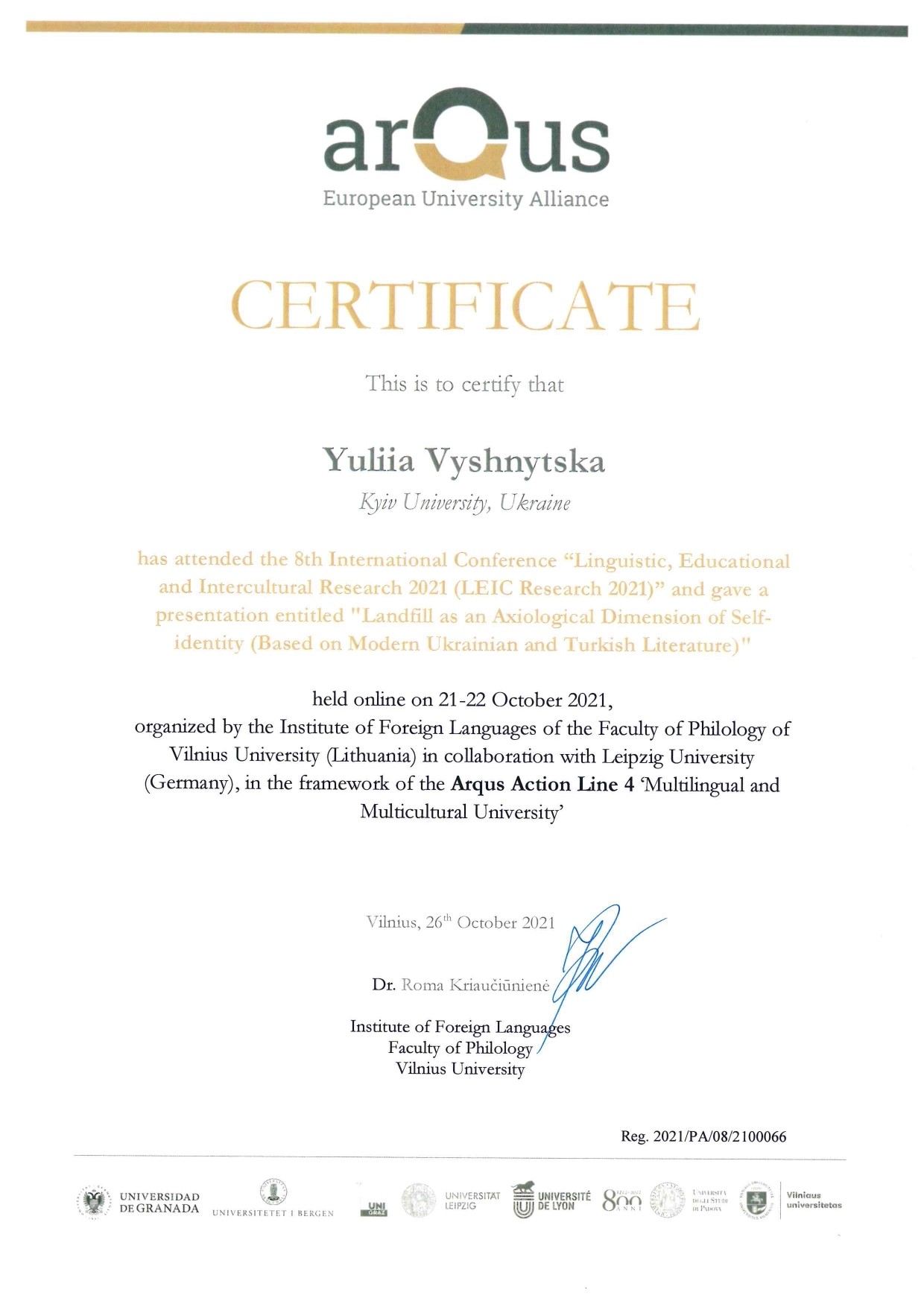 | 7626 | Міжнародна конференція Linguistic, Educational and Intercultural Research 2021 (LEIC Research 2021) 21 – 22 October 2021, | Landfill as an axiological dimension of self-identity (based on modern Ukrainian and Turkish literature) | Vilnius, Lithuania |