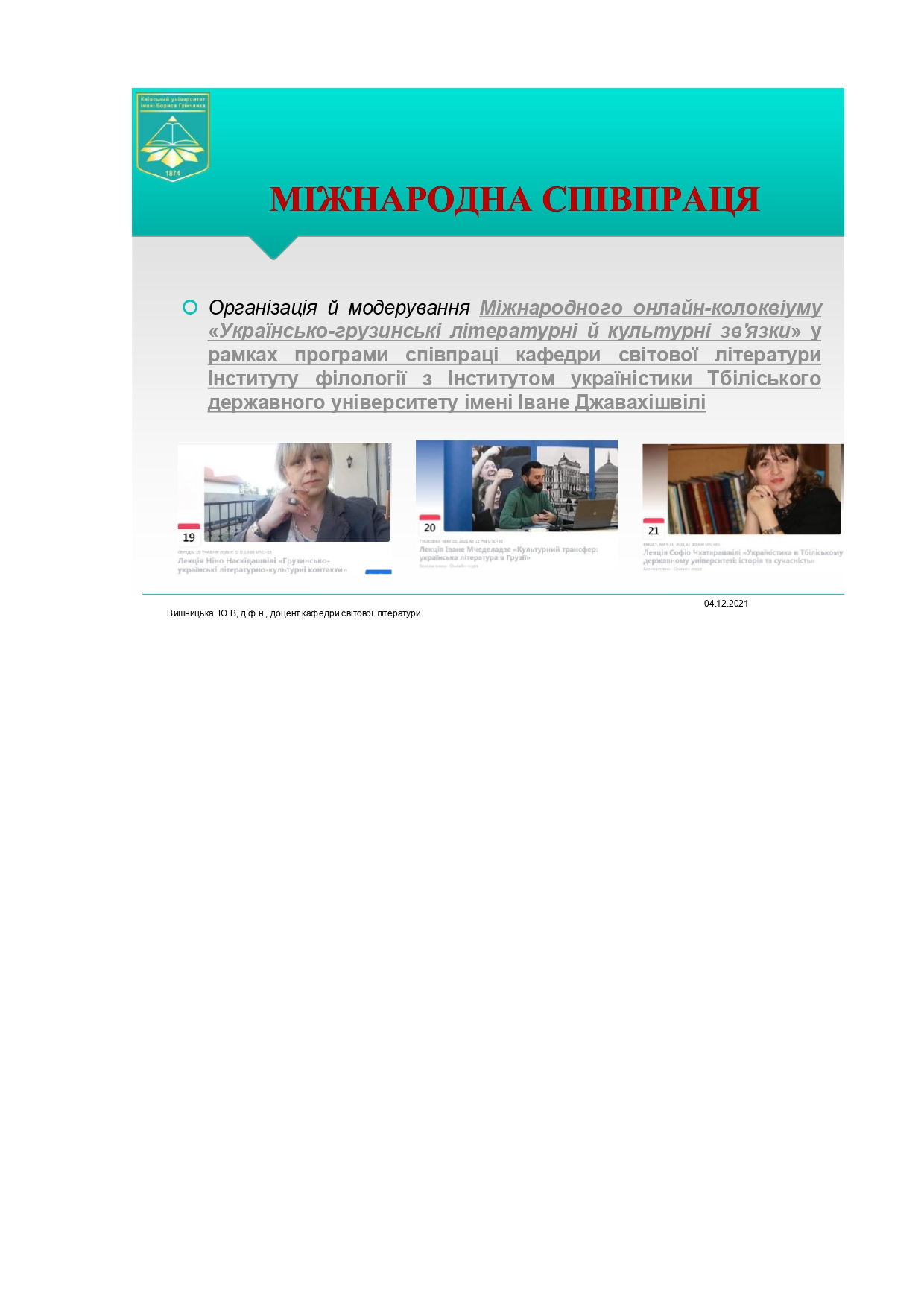 | 7628 | Міжнародний онлайн-колоквіум «Українсько-грузинські літературні й культурні зв'язки» у рамках програми співпраці кафедри світової літератури Інституту філології з Інститутом україністики Тбіліського державного університету імені Іване Джавахішвілі | триденне модерування Міжнародного онлайн-колоквіуму | Київ, Кївський університет імені Бориса Грінченка |