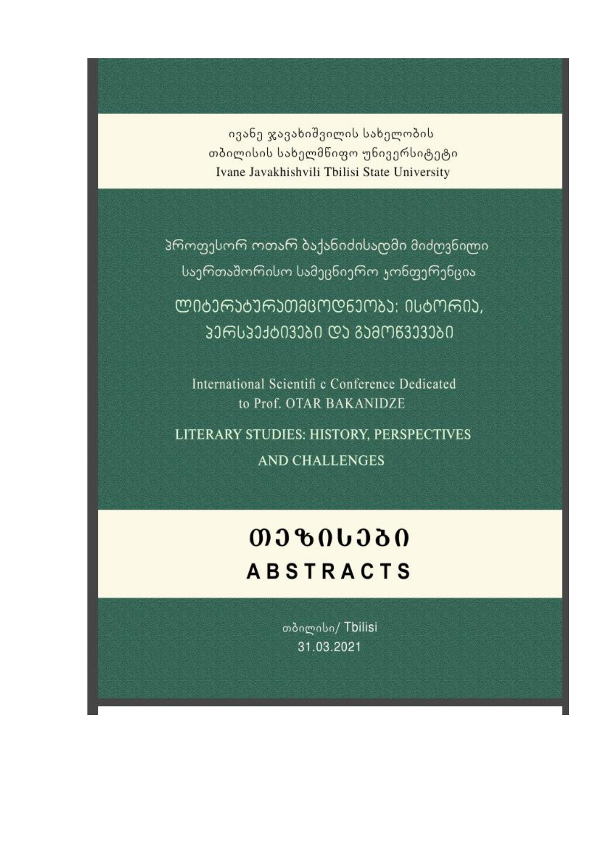 | 7629 | Міжнародна конференція, присвячена професору Отару Баканідзе: «Літературознавство: історія, перспективи та виклики» / International Scientific Conference Dedicated to Prof. Otar Bakanidze «Literary Studies: History, Perspectives and Challenges» (Тбілісі, 31.03.2021) | Образно-мотивні координати ідентичності в романі Юрія Винничука «Танго смерті» | Тбілісі, Грузія |