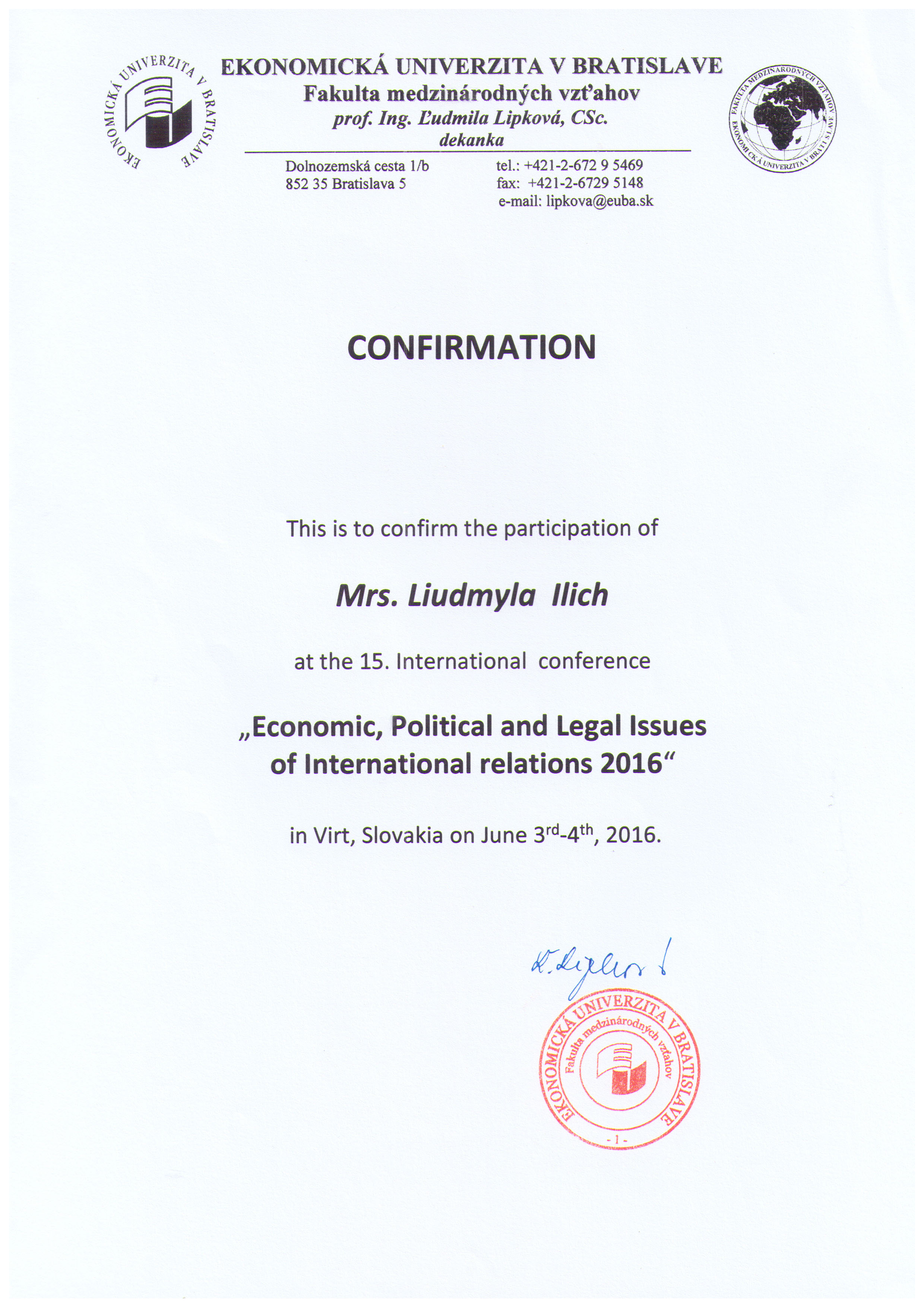 | 4329 | 17th lnternational Scientific Conference on «lnternational Relations 2016: Current issues of world economy and politics» | Evaluation of matching skills to job | Smolenice, Slovak Republic | document.pdf | |