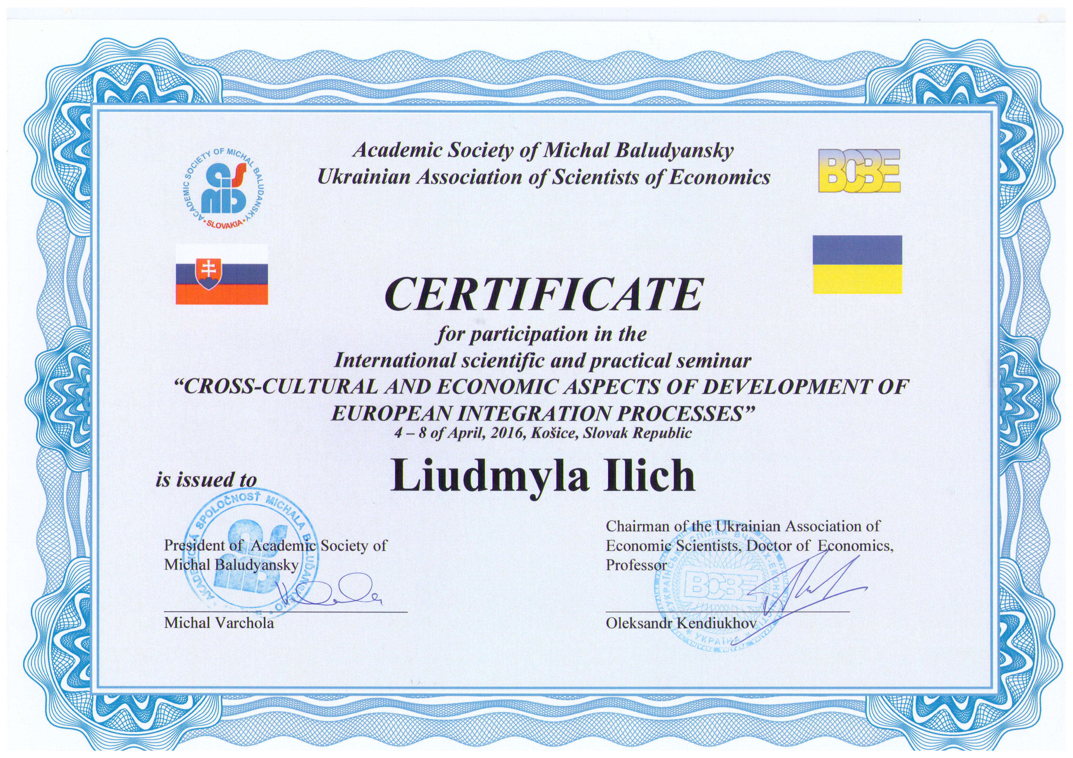 | 4332 | International and practical seminar "Cross-cultural and economic asspects of development of european integration processes" | Methodological approaches to forecasting skills: EU and Ukraine experience | Кosice, Slovak Republic |