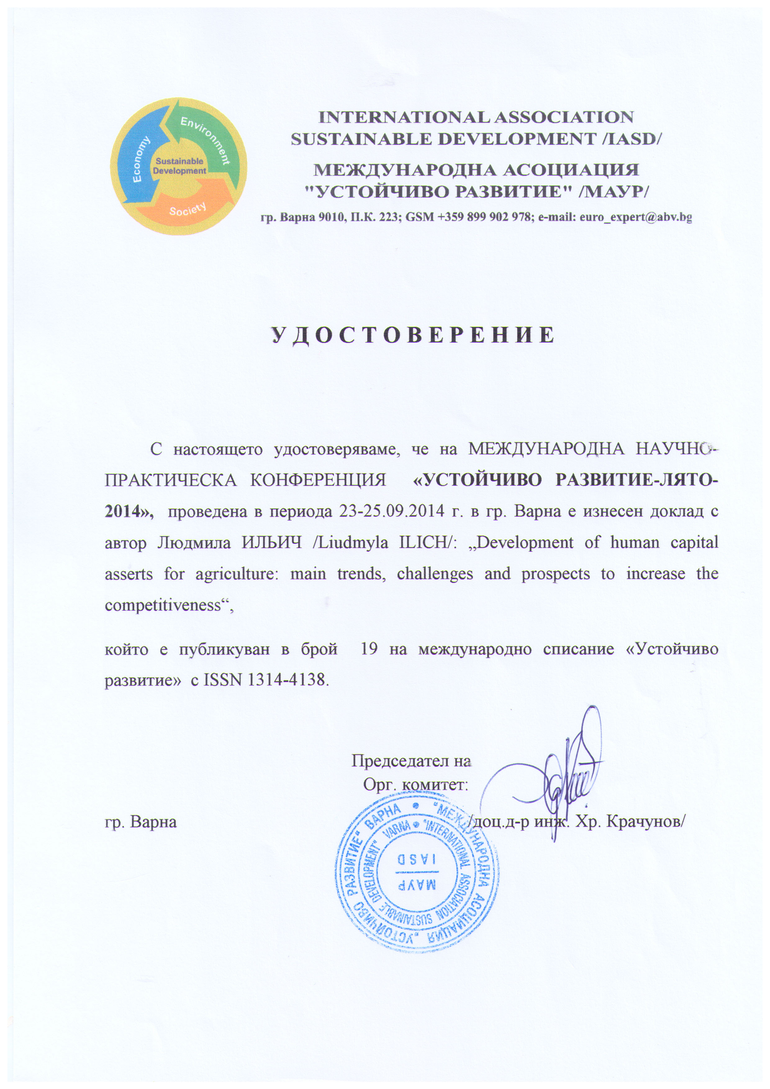 | 4333 | 15th International Scientific Conference 'Sustainable Development. Summer 2014' | Development of human capital asserts for agriculture: main trends, challenges and prospects to increase the competitiveness | Varna, Bulgaria |