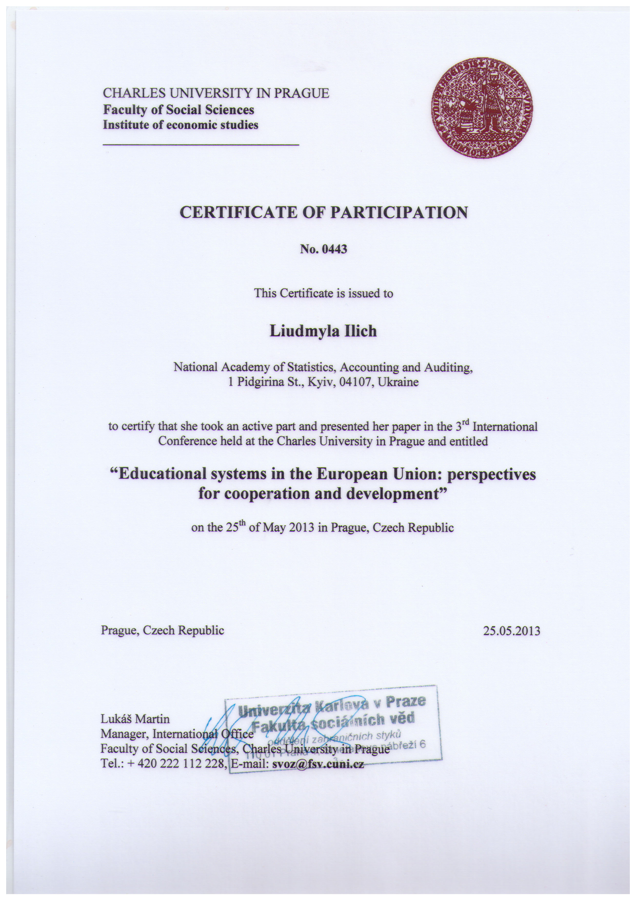 | 4337 | International scientific conference «Educational systems in the European Union: perspectives for cooperation and development» | «Youth labor market in Ukraine: main trends, reasons of unemployment and possibilities to be employed» | Prague, Czech Republic |