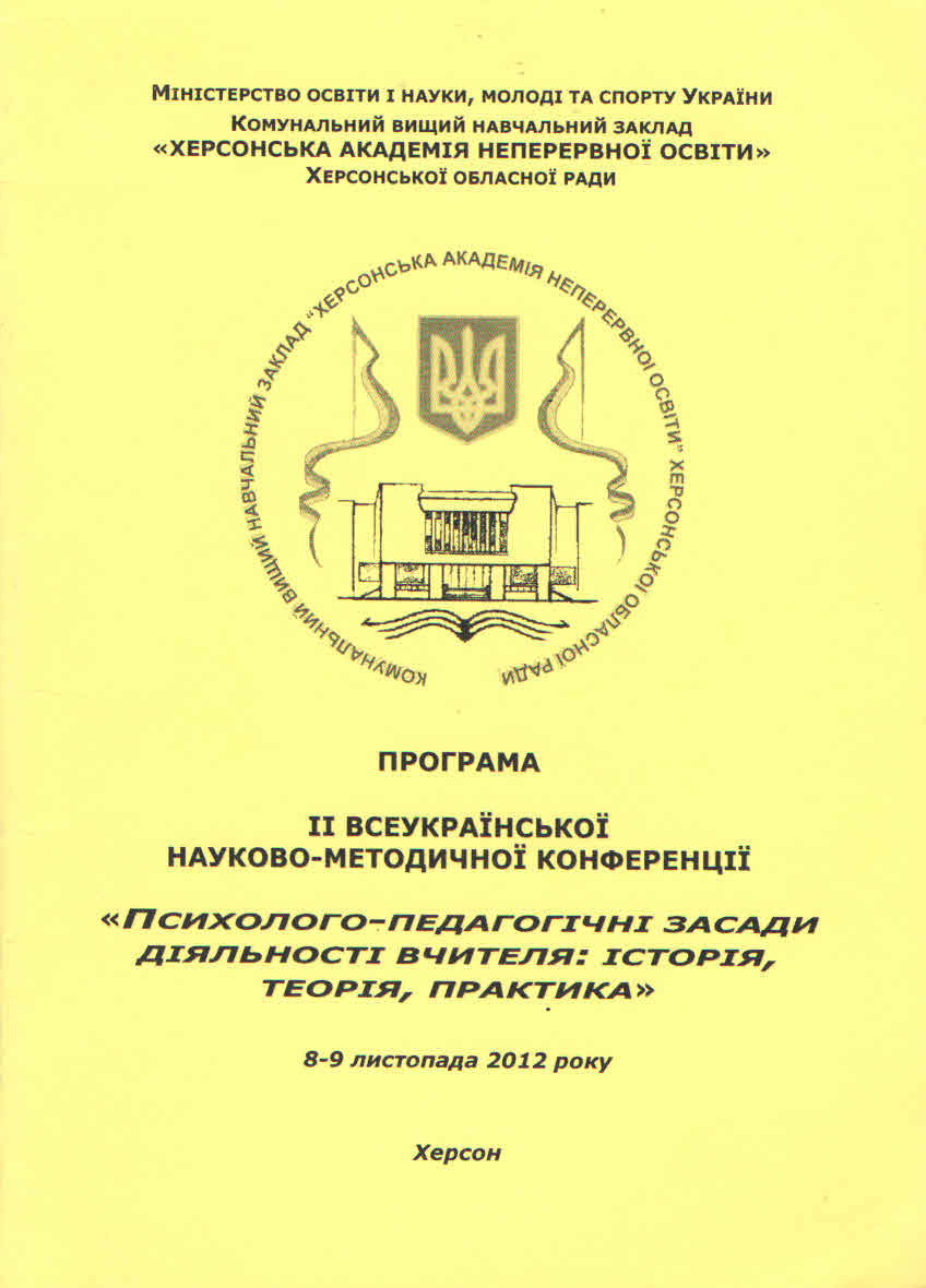 | 600 | ІІ Всеукр. наук.-метод. конф. [«Психолого-педагогічні засади діяльності вчителя: історія, теорія, практика»] | Артпедагогіка як наука: зміст, суть, значення та форми впровадження | м. Херсон, КВНЗ 'Херсонська академія неперервної освіти' |