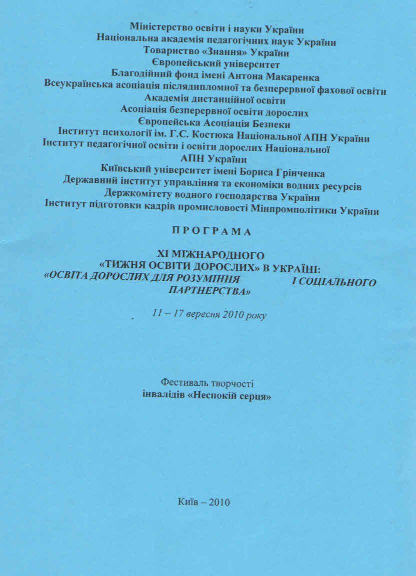 | 602 | ХІ Міжнародний «Тиждень освіти дорослих» в Україні: «Освіта дорослих для розуміння і соціального партнерства» | Критерії сформованості умінь майбутніх учителів іноземних мов до творення віртуальної педагогічної взаємодії | м. Київ, Київський університет імені Бориса Грінченка |