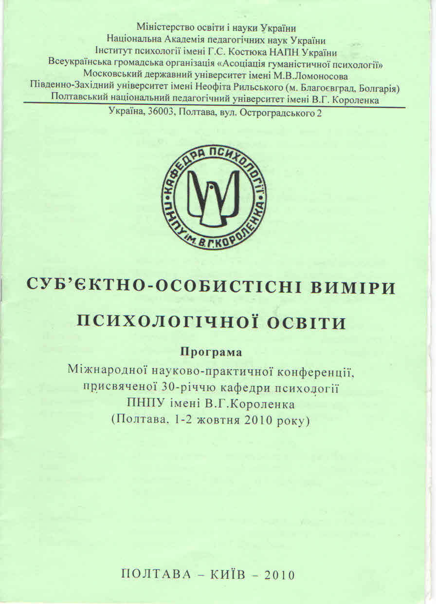 | 603 | Міжнародна науково-практична конференція «Суб’єктно-особистісні виміри психологічної освіти» | Соціально-психологічні тренінгові системи творення віртуально-навчального іншомовного середовища | м. Полтава, Полтавський національний педагогічний університет імені В.Г. Короленка |