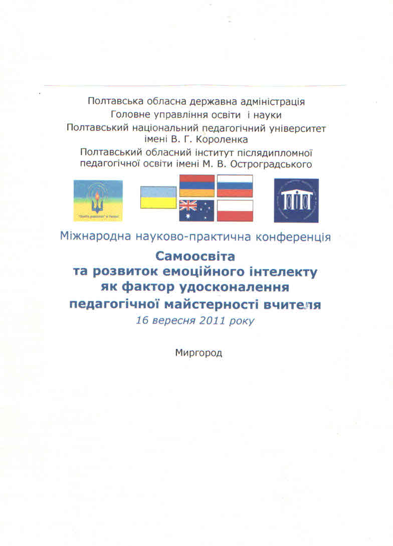 | 604 | Міжнар. наук.-практ. конф. [«Самоосвіта та розвиток емоційного інтелекту як фактор удосконалення педагогічної майстерності вчителя»] | Емоційно-почуттєвий компонент творення віртуальної педагогічної взаємодії на уроках іноземних мов | м. Миргород |