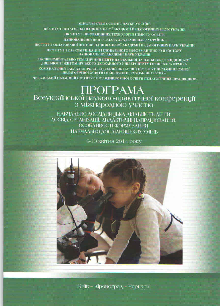 | 610 | Всеукр. наук.-практ. конф. з міжнар. участю [«Навчально-дослідницька діяльність дітей: досвід організації, дидактичні напрацювання, особливості формування навчально-дослідницьких умінь»] | Розвиток емоційної сфери учнів початкової школи засобами творення віртуально-навчального іншомовного середовища | м. Кіровоград, Національний центр 'Мала академія наук України' |