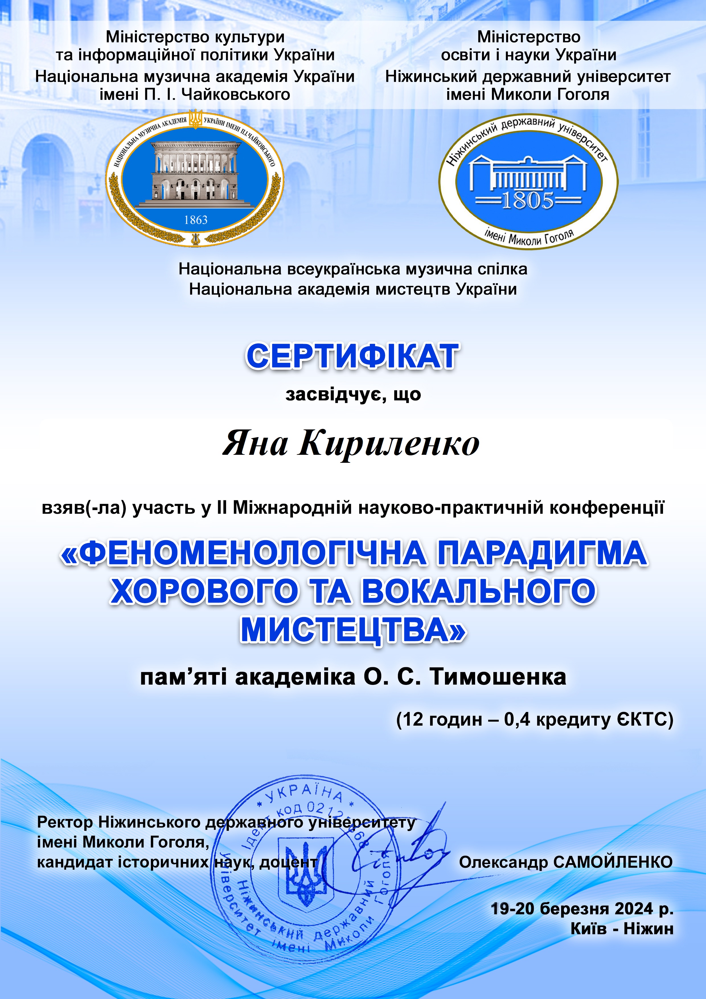 | 120 | Факультет музичного мистецтва і хореографії | Кафедра академічного та естрадного вокалу | Міжнародні конкурси, проведені в Україні | ХХІ Відкритий міжнародний юніорський конкурс музично-виконавської майстерності імені академіка О.С.Тимошенка | Україна, Київ-Ніжин | 2024 | Кириленко Я_merged.pdf |