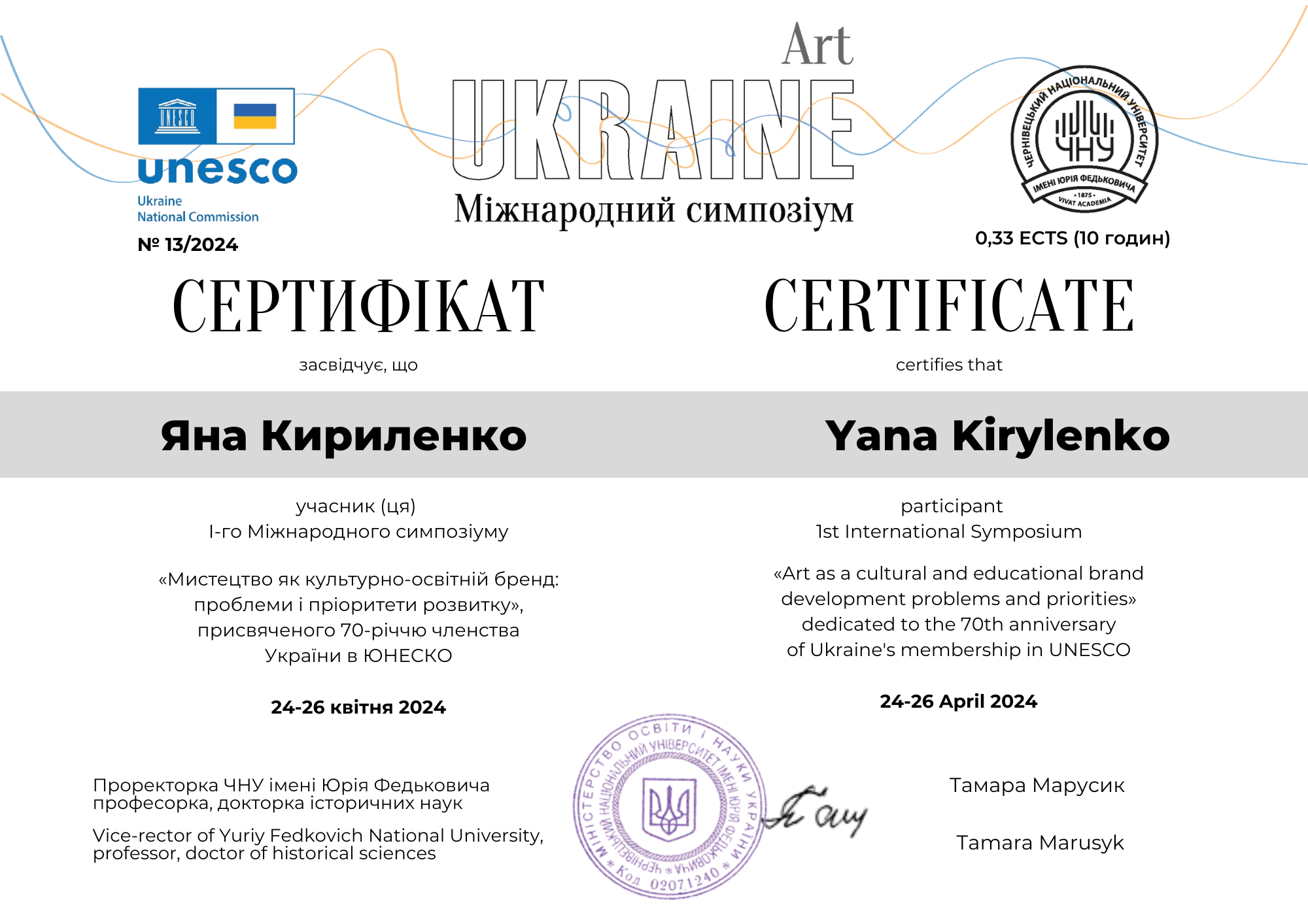 | 10366 | І Міжнародний симпозіум, присвячений 70-річчю членства України в ЮНЕСКО | Євроінтеграція сучасної вокальної української культури | Чернівці |