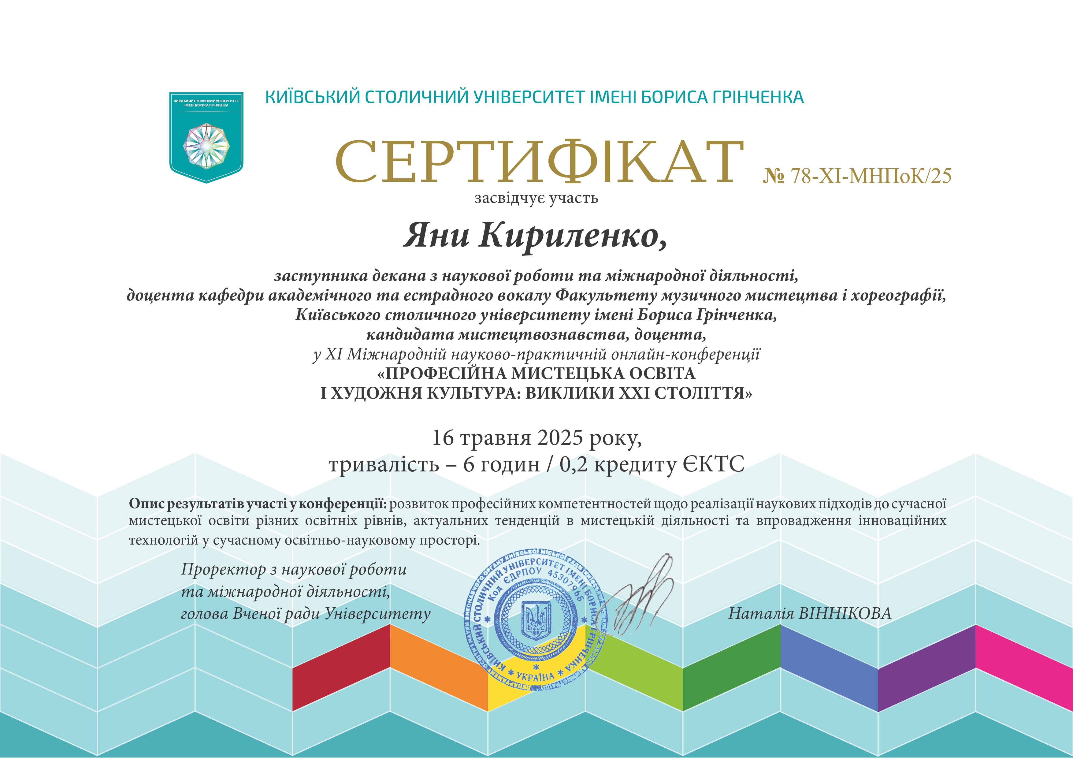| 6794 | Професійна мистецька освіта і художня культура: виклики ХХІ століття" | «Сучасні тенденції контамінації у хоровому мистецтві» | Київський університет імені Бориса Грінченка |