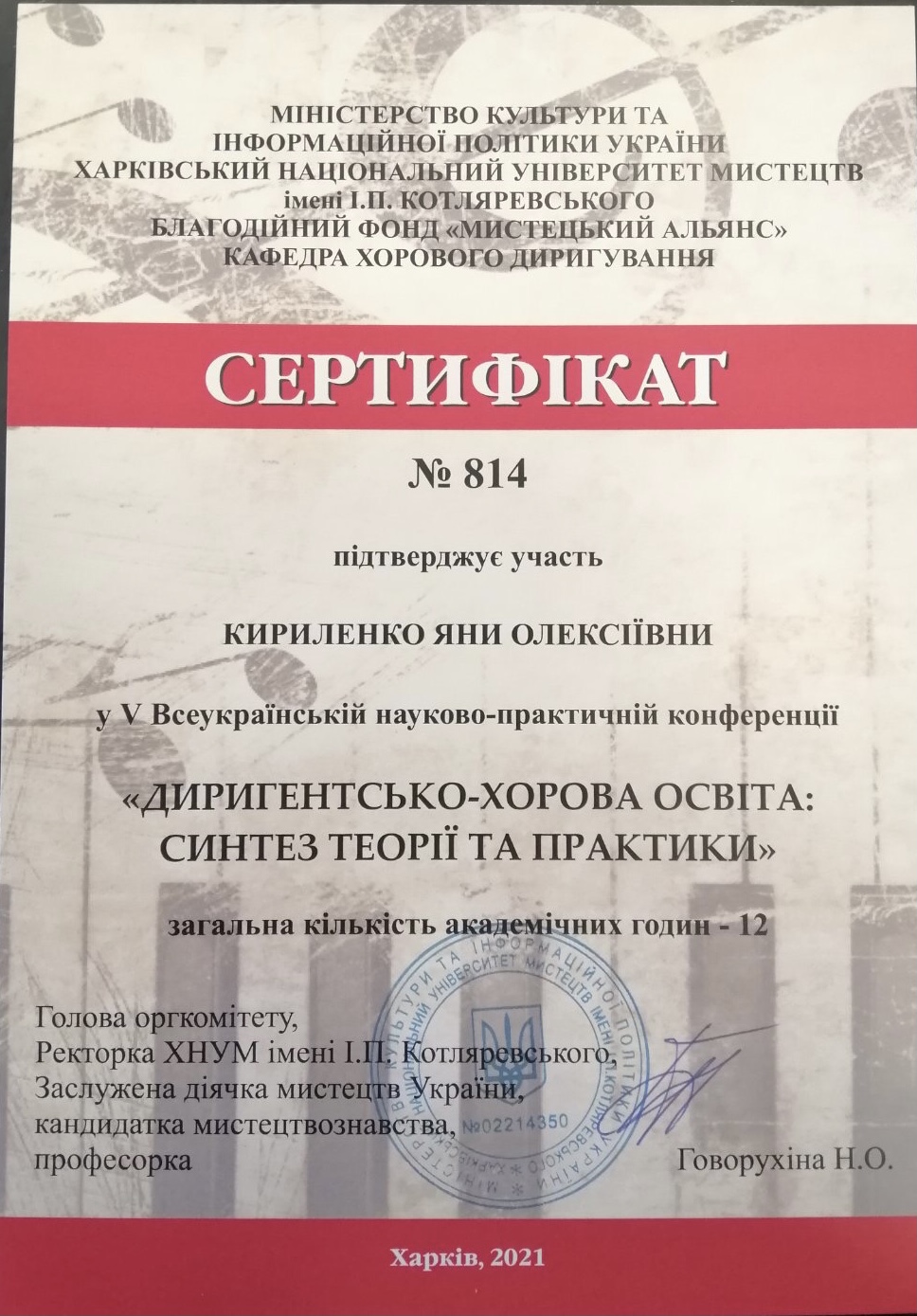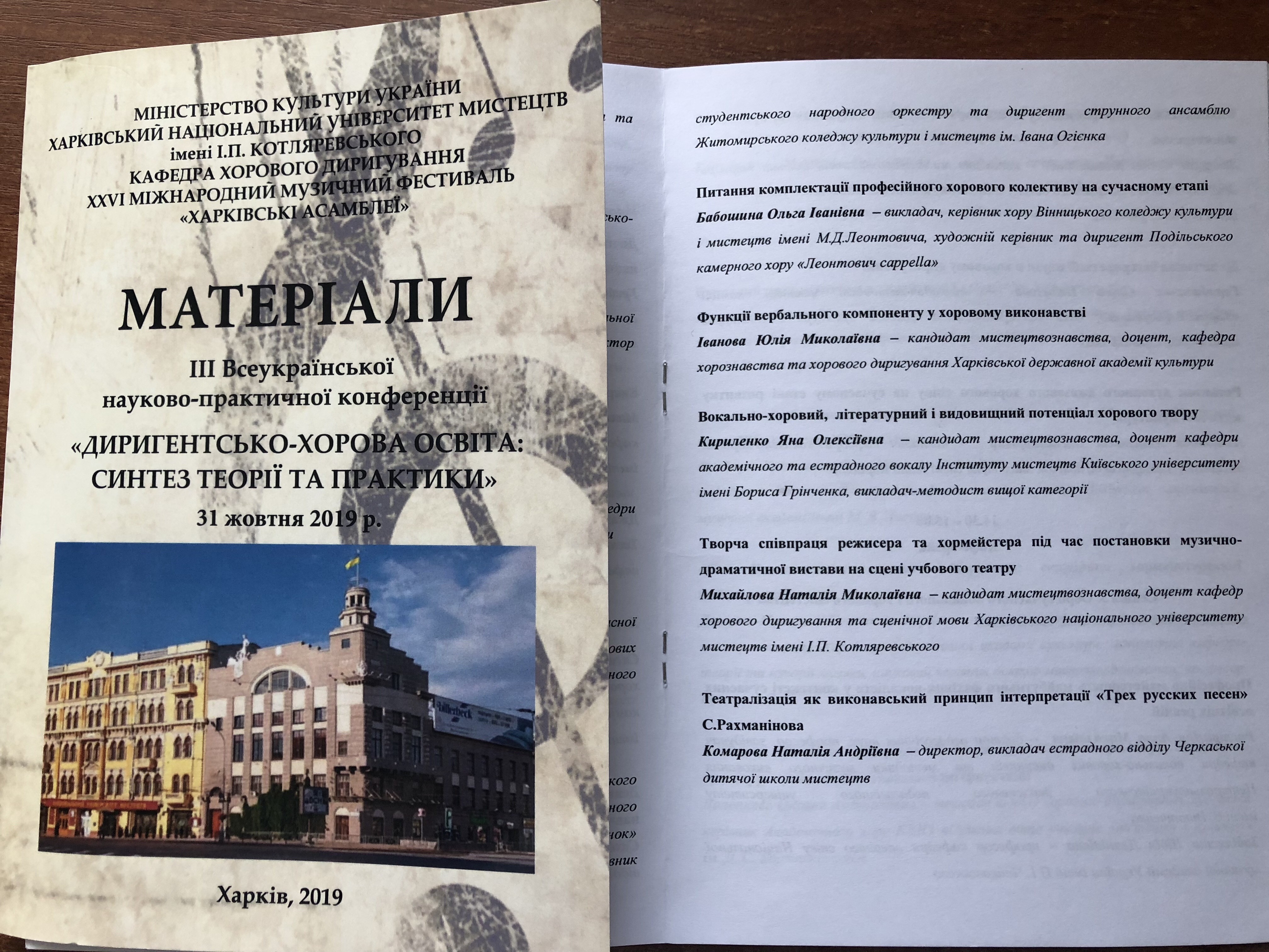 | 5272 | ІІІ Всеукраїнська науково-практична конференція "Диригентсько-хорова освіта: синтез теорії та практики» | «Вокально-хоровий, літературний і видовищний потенціал хорового твору» | м. Харків |