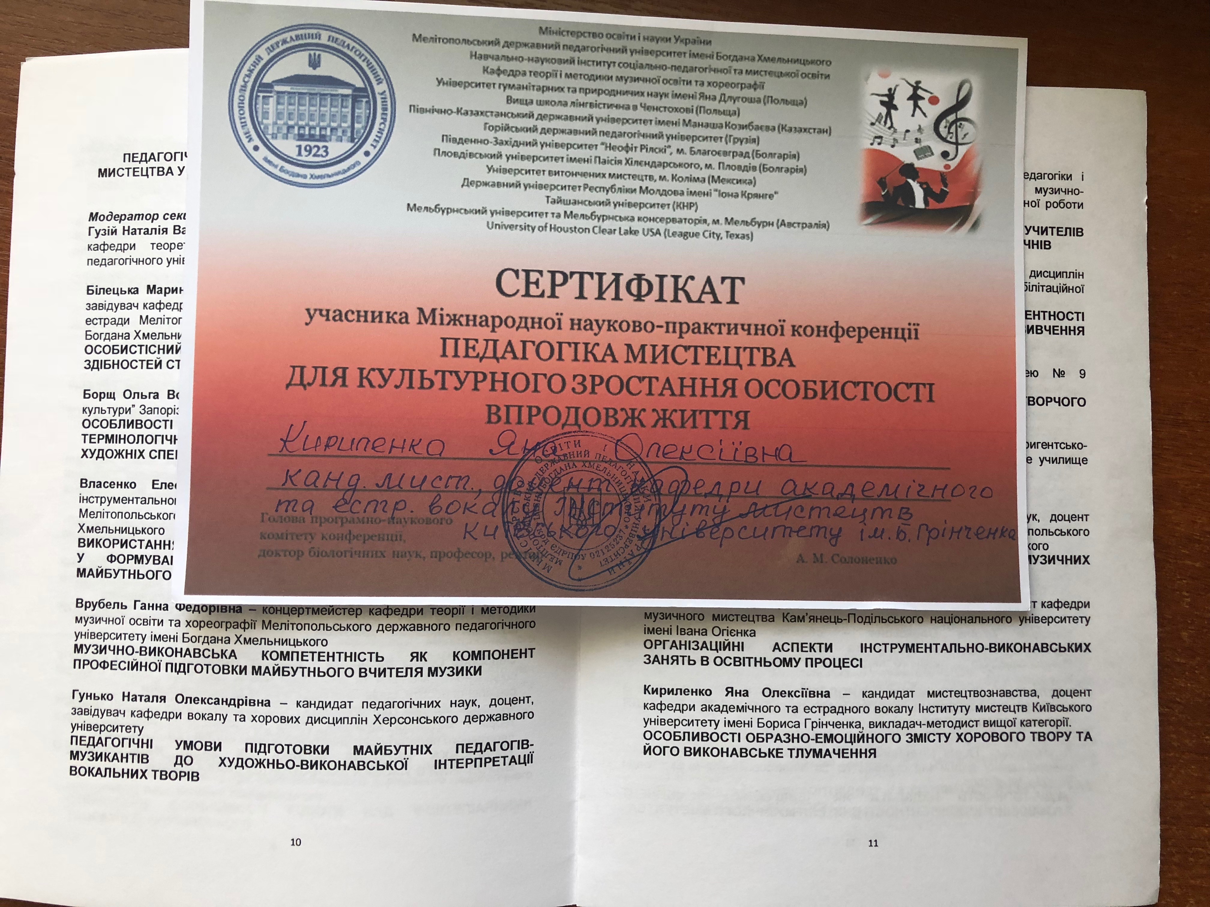 | 5273 | «Педагогіка мистецтва для культурного зростання особистості впродовж життя» | «Особливості образно-емоційного змісту хорового твору та його виконавське тлумачення» | м. Мелітополь |