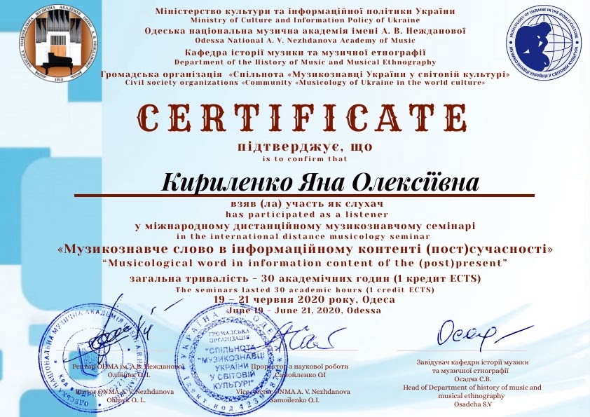 | 5438 | Міжнародний дистанційний музикознавчий семінар \ | слухач | Одеса |