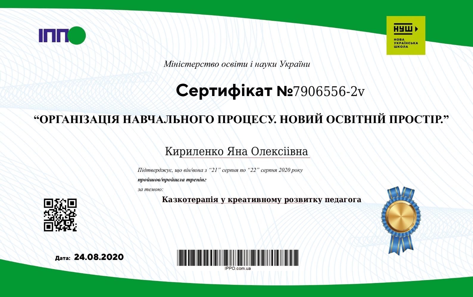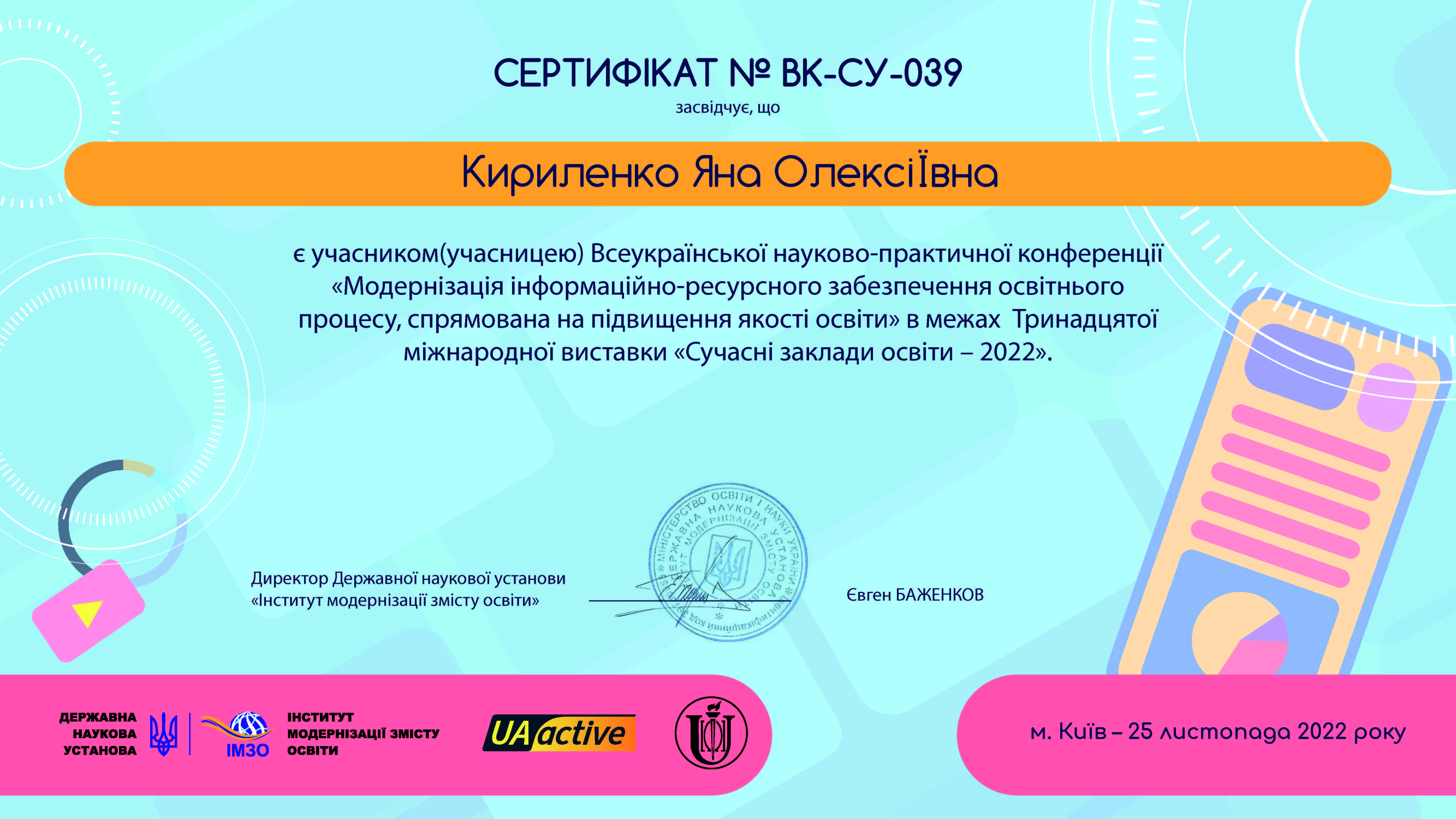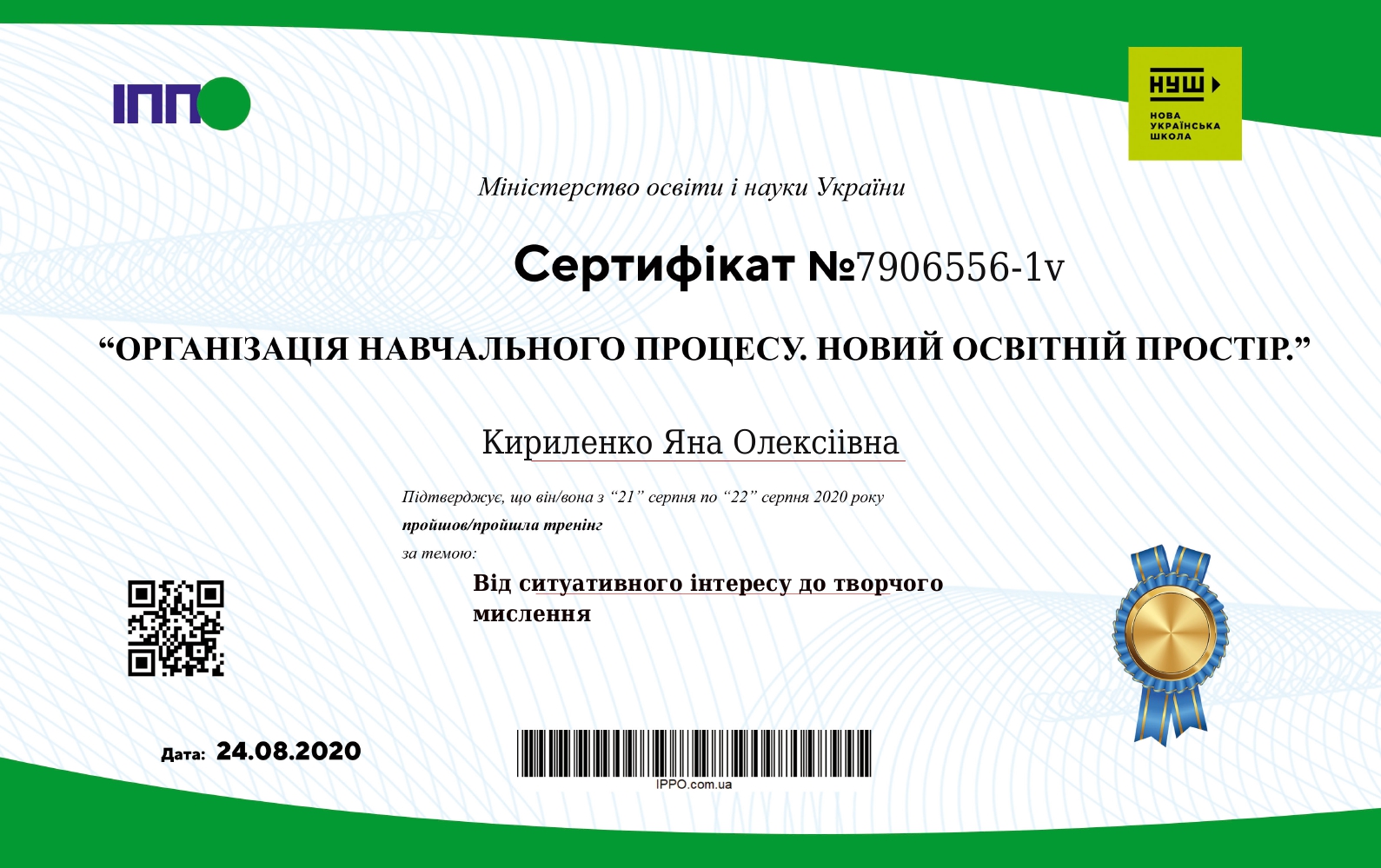 | 5458 | Всеукраїнська практична онлайн конференція "Організація навчального процесу. Новітній освітній простір" | слухач | Київ |