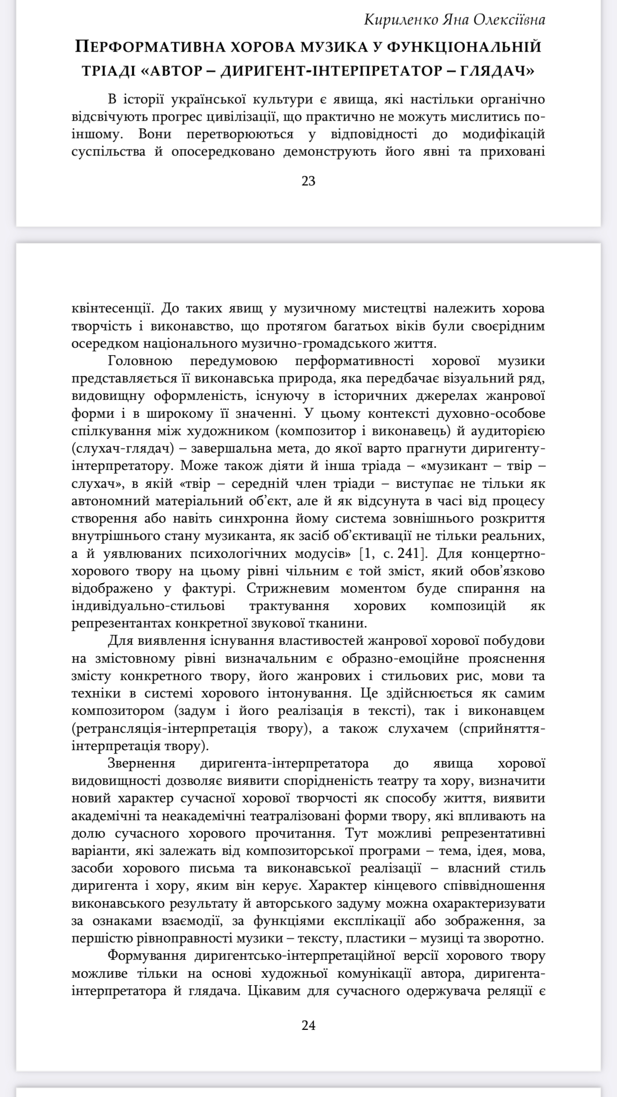 | 5797 | "Культурно-мистецьке середовище: творчість та технології" Матеріали Чотирнадцятої Міжнародної науково-творчої дистанційної конференції | ""Перформативна хорова музика у функціональній тріаді "автор - диригент-інтерпретатор - глядач"" | Київ |