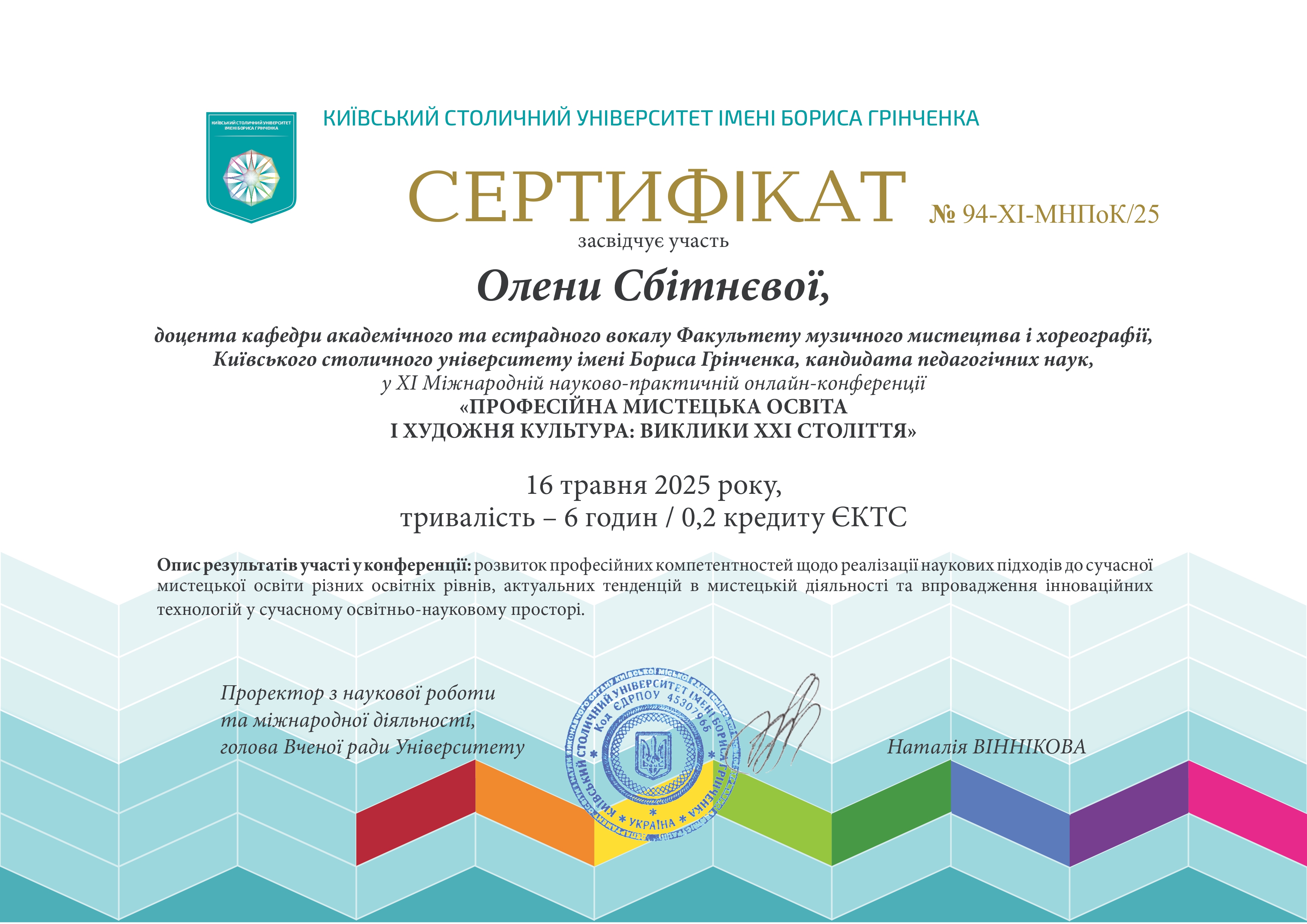 | 8369 | XІІІ Міжнародної науково-практичної конференції «ДУХОВНА СИЛА НАРОДУ В БИТВІ ЗА УКРАЇНУ» в рамках міжнародного проєкту Пола Д. Шафера «Епоха Культури» | Відродження традицій дитячого хорового виконавства в Україні у ХХІ столітті | м. Київ – м. Сєвєродонецьк – м. Дніпро | document.pdf | |