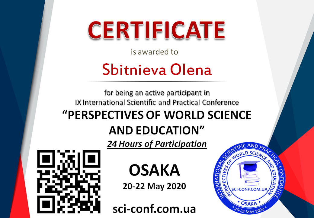 | 5327 | PERSPECTIVES OF WORLD SCIENCE AND EDUCATION | Розвиток хорового мистецтва України в ХХ столітті. | м. Осака, Японія |