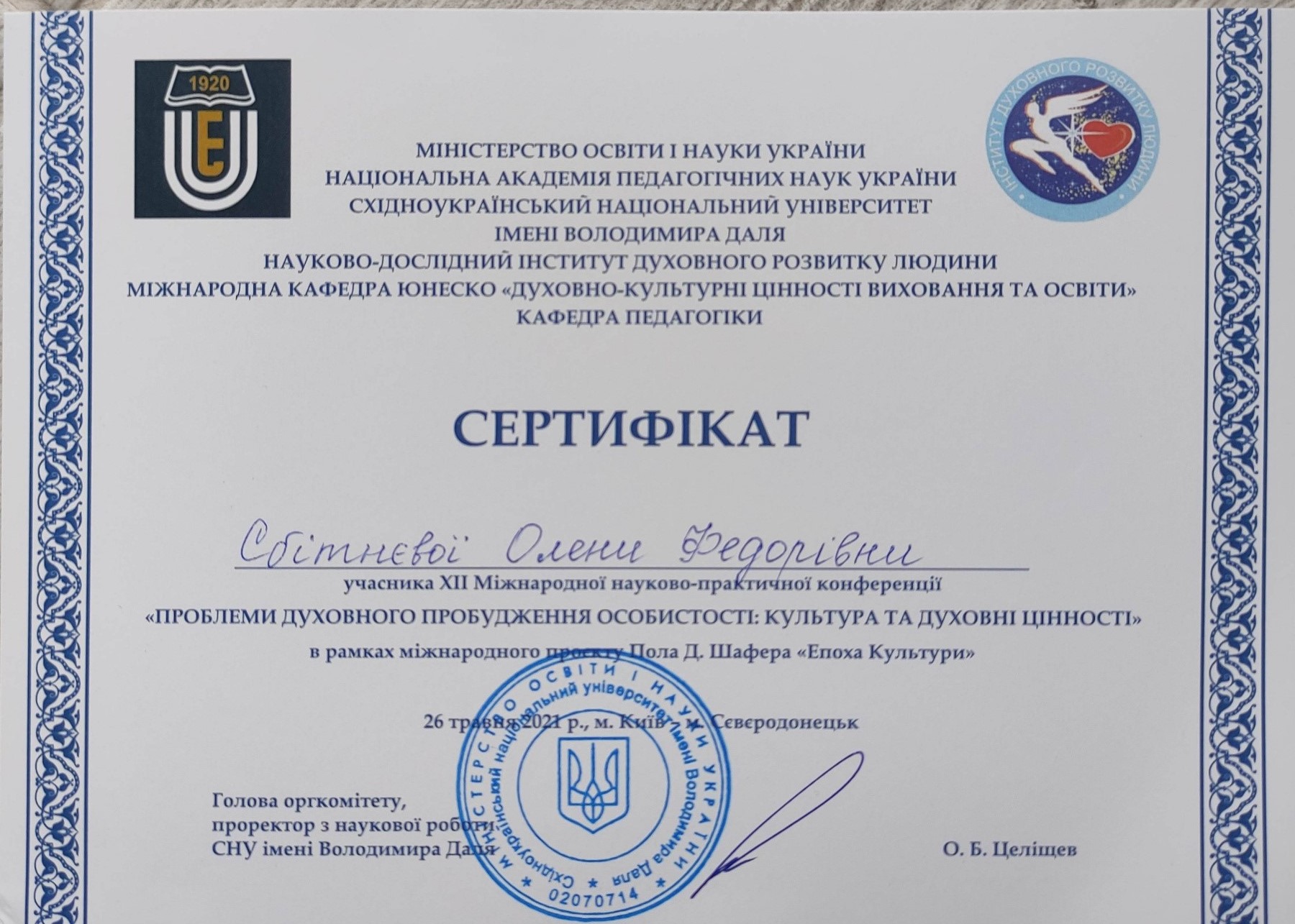 | 7429 | «ПРОБЛЕМИ ДУХОВНОГО ПРОБУДЖЕННЯ ОСОБИСТОСТІ: КУЛЬТУРА ТА ДУХОВНІ ЦІННОСТІ» в рамках міжнародного проекту Пола Д. Шафера «Епоха Культури» | Розвиток вокальної культури майбутніх вокалістів у процесі фахового навчання | м. Київ- м. Сєвєродонецьк |