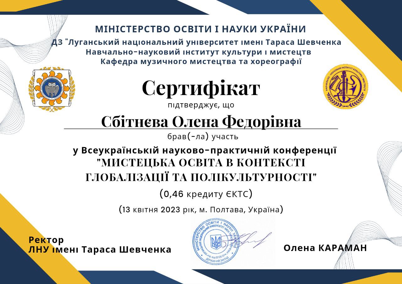 | 511 | Факультет музичного мистецтва і хореографії | Кафедра академічного та естрадного вокалу | 4.1 | 1 | 2025 | https://www.researchgate.net/profile/Olena_Sbitnieva |