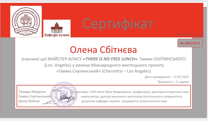 | 9289 | Міжнародний мистецький проєкт "Гамма Скупинський" | Майстер-клас "There is no free lunch" Гамми Скупинського | Чернівці- Лос-Анджелес |