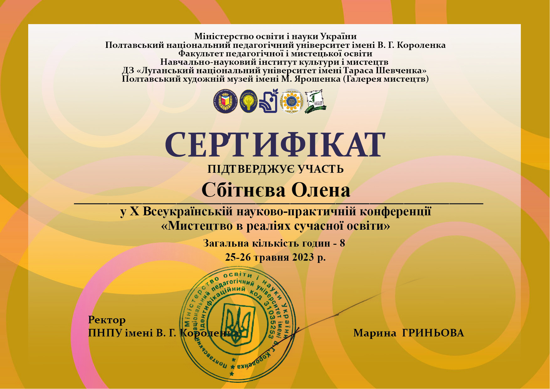 | 9095 | V Всеукраїнська науково-практична конференція "Мистецька освіта в контексті глобалізації та полікультурності" | Естетична культура як невід’ємний складник духовної культури особистості | м. Полтава |