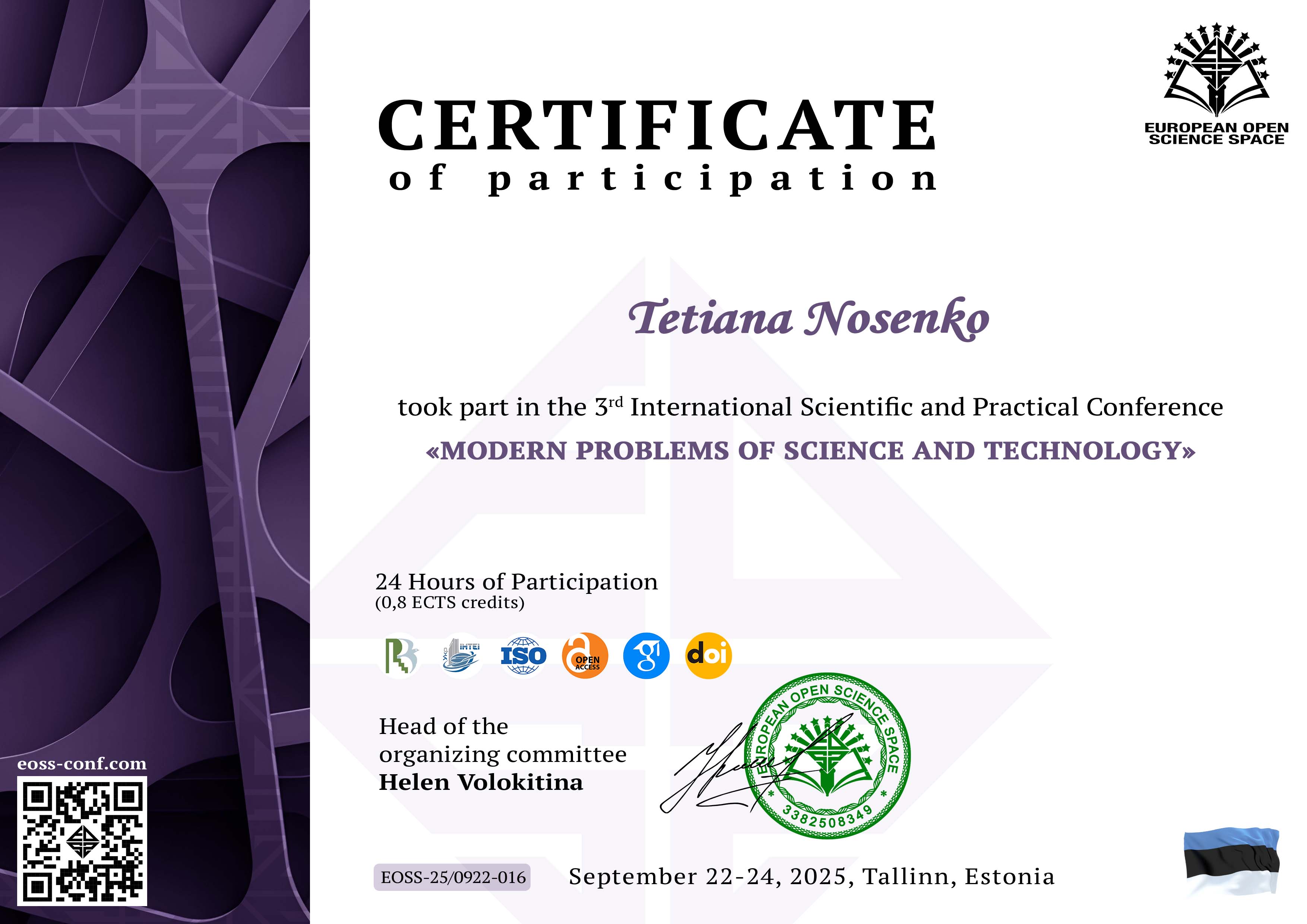 | 12821 | III International Scientific and Practical Conference “Modern Problems of Science and Technology” | Application of artificial intelligence algorithms for detecting and modeling the spread of pollution in river ecosystems | Tallinn, Estonia |
