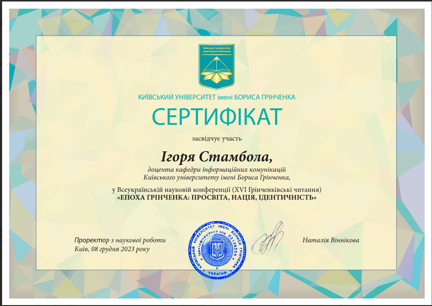 11179 Борис Грінченко: знаний і невідомий (до 160-річного ювілею Великого Українця). Всеукраїнська наукова конференція Вишиванка Бориса Грінченка: відтворення та конструювання актуальних патріотичних смислів Харків document.pdf
