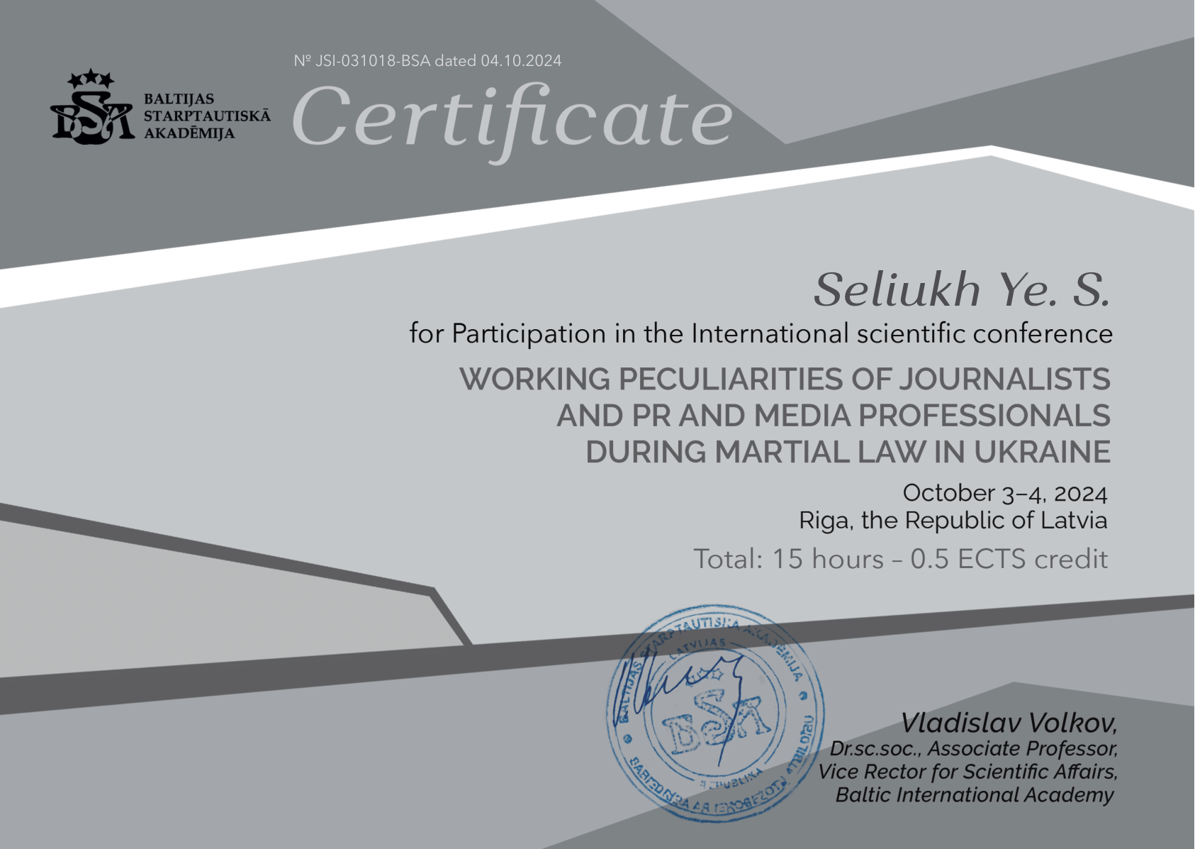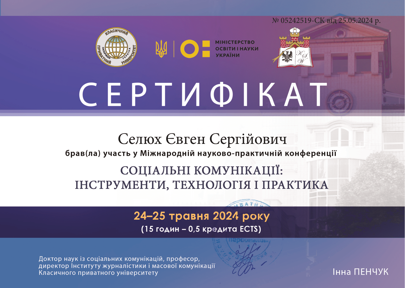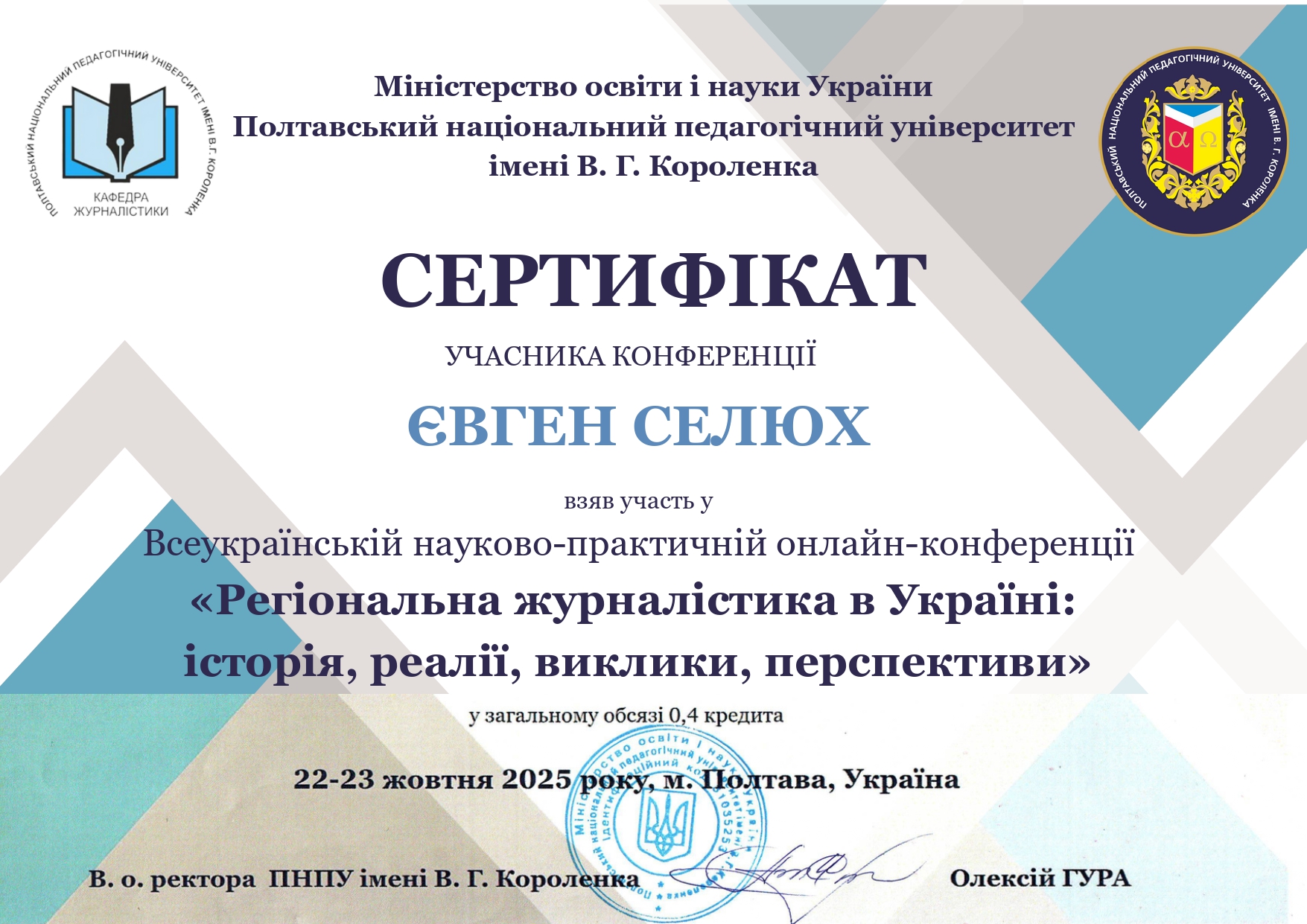 | 966 | Факультет журналістики | Кафедра реклами та зв'язків з громадськістю | 2.8 | 0 | 2025 | https://www.researchgate.net/profile/Yevhen-Seliukh |