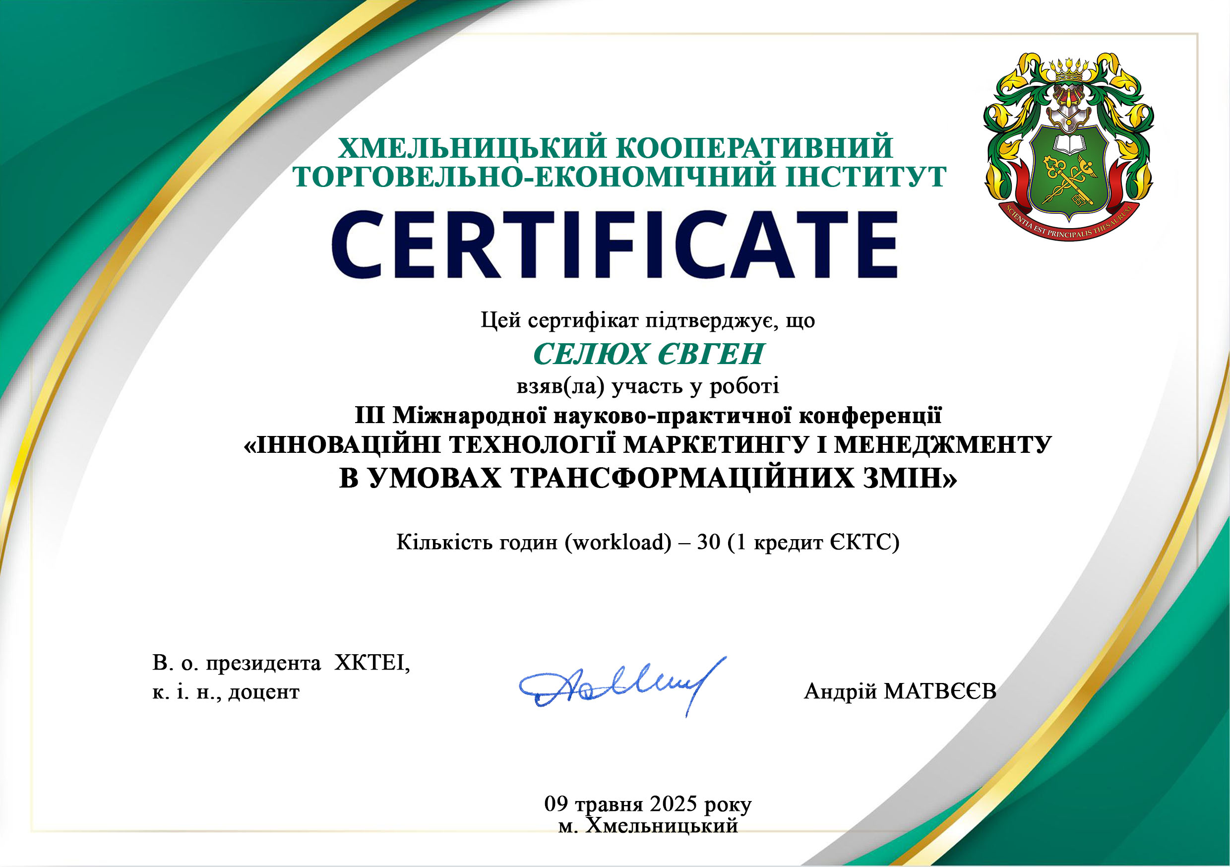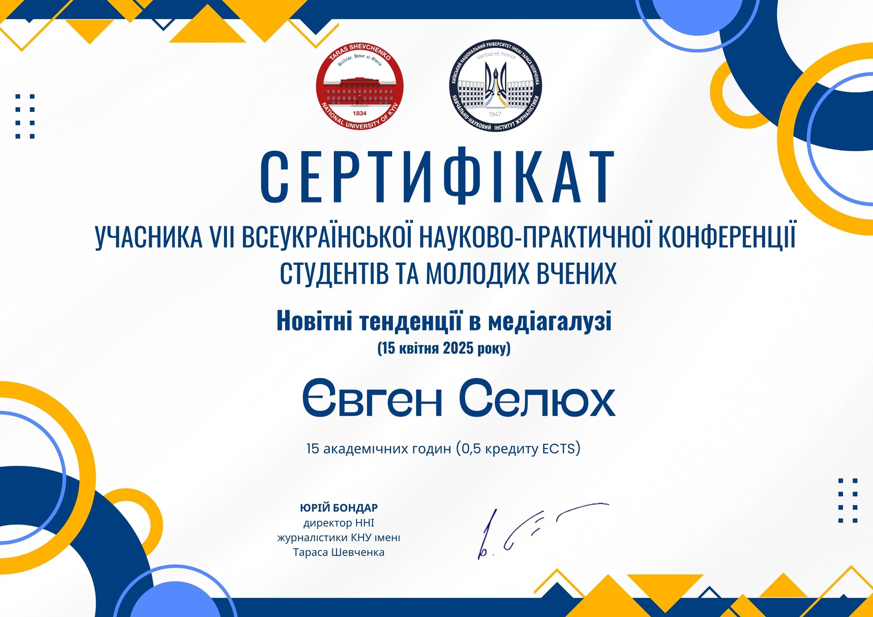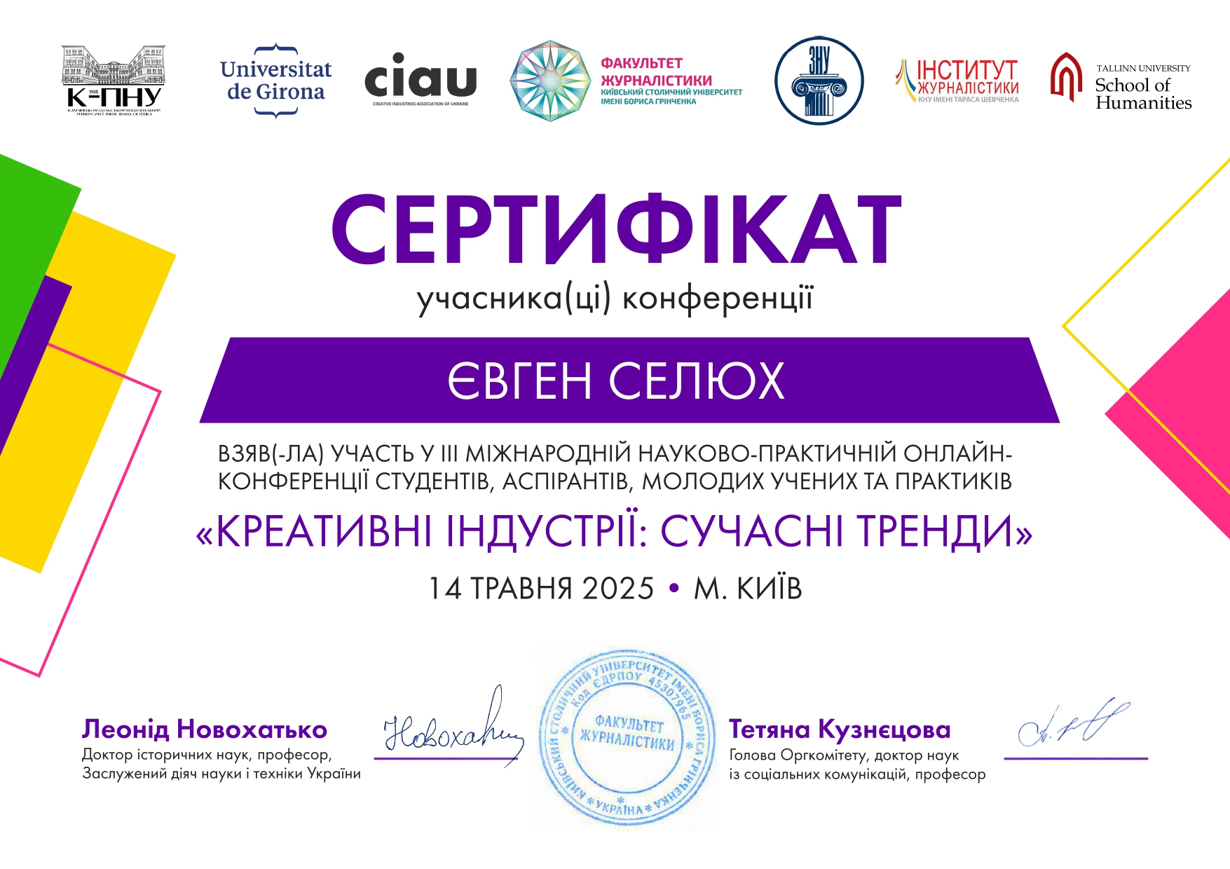 | 966 | Факультет журналістики | Кафедра реклами та зв'язків з громадськістю | 2.8 | 0 | 2025 | https://www.researchgate.net/profile/Yevhen-Seliukh |