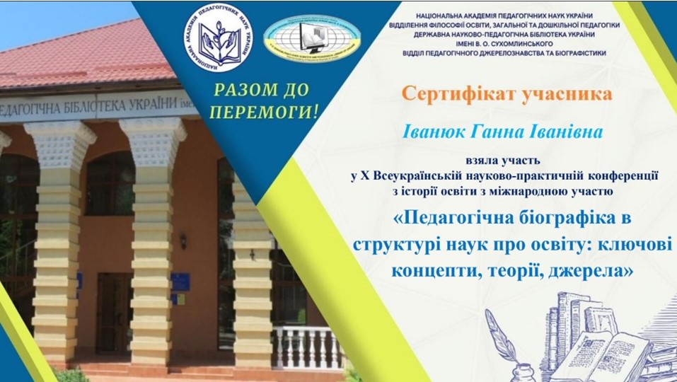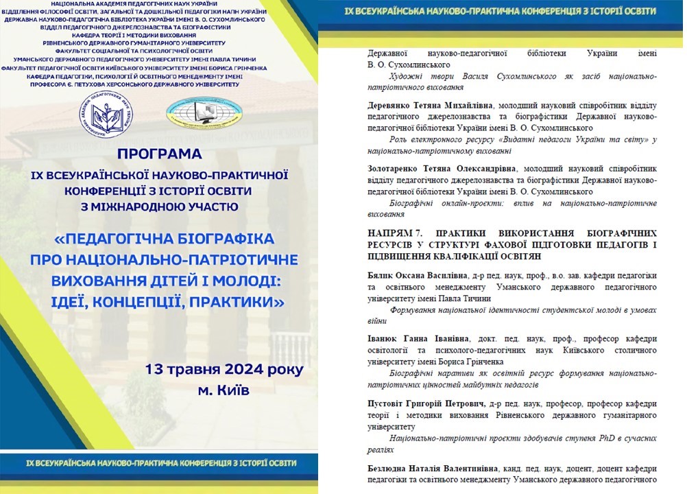| 10364 | ІХ ВСЕУКРАЇНСЬКА НАУКОВО-ПРАКТИЧНА КОНФЕРЕНЦІЯ З ІСТОРІЇ ОСВІТИ З МІЖНАРОДНОЮ УЧАСТЮ «Педагогічна біографіка про національно-патріотичне виховання дітей і молоді: ідеї, концепції, практики» | Біографічні наративи як освітній ресурс формування національно-патріотичних цінностей майбутніх педагогів | ДНПБ імені В.О. Сухомлинського |