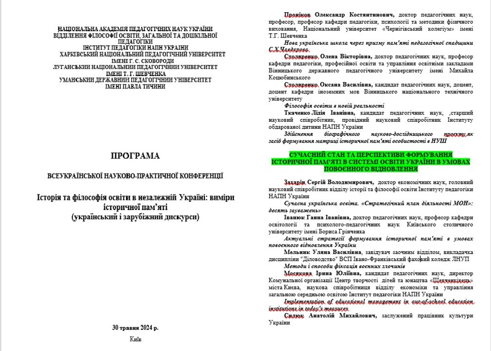 | 10476 | ВСЕУКРАЇНСЬКА НАУКОВО-ПРАКТИЧНА КОНФЕРЕНЦІЯ "Історія та філософія освіти в незалежній Україні: виміри історичної пам’яті (український і зарубіжний дискурси)" | Актуальні стратегії формування історичної пам'яті в умовах повоєнного відновлення України | Інститут педагогіки НАПН України |