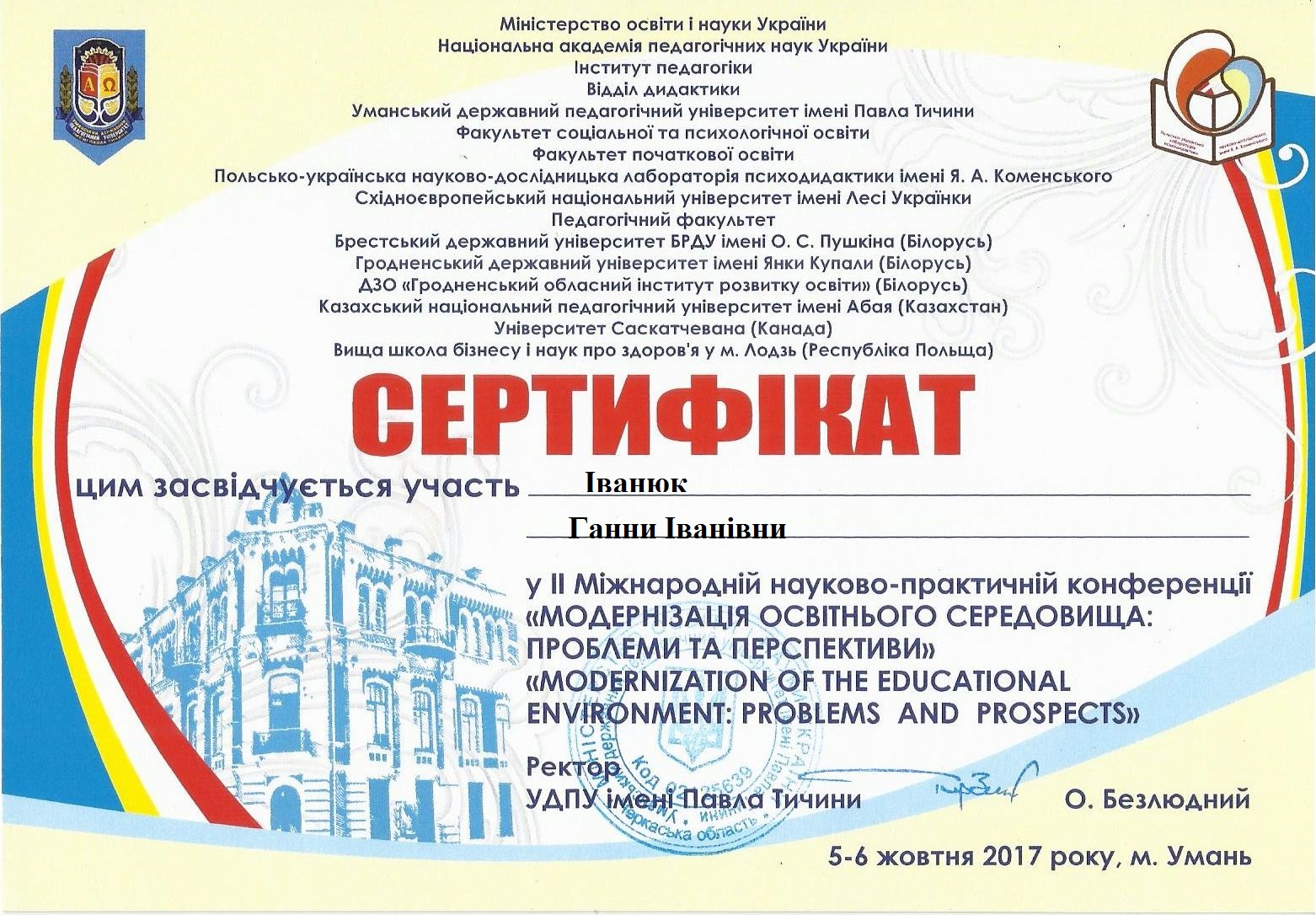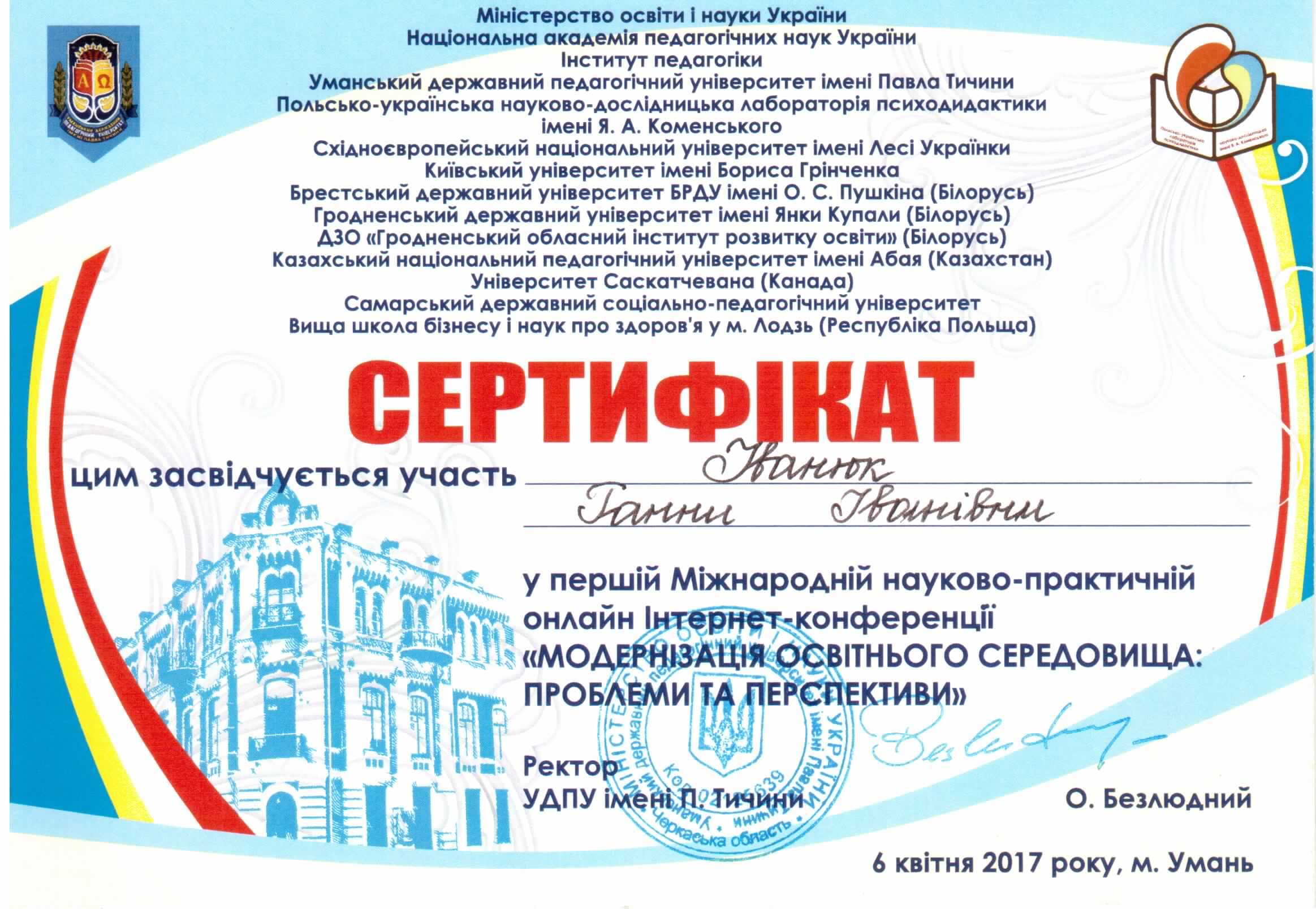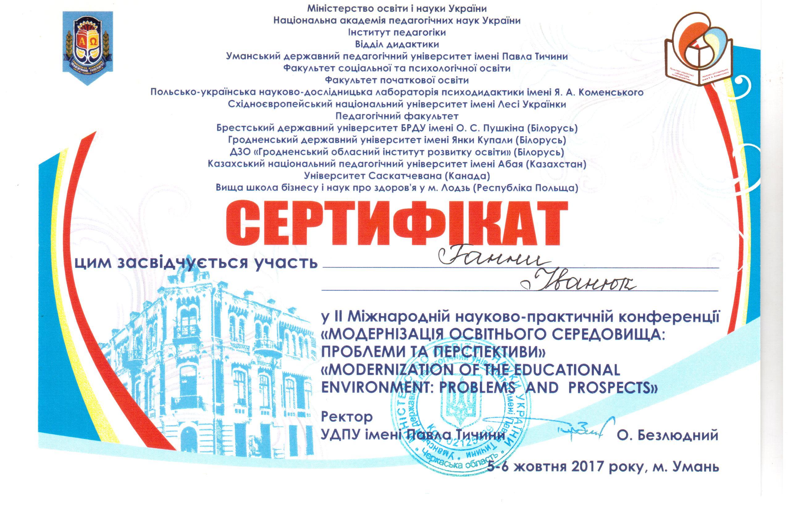 | 1645 | Перша Міжнародна науково-практична онлайн Інтернет-конференція "Модернізація освітнього середовища: проблеми та перспективи" | Нова стратегія розвитку освітнього середовища вищого навчального закалду | м. Умань |