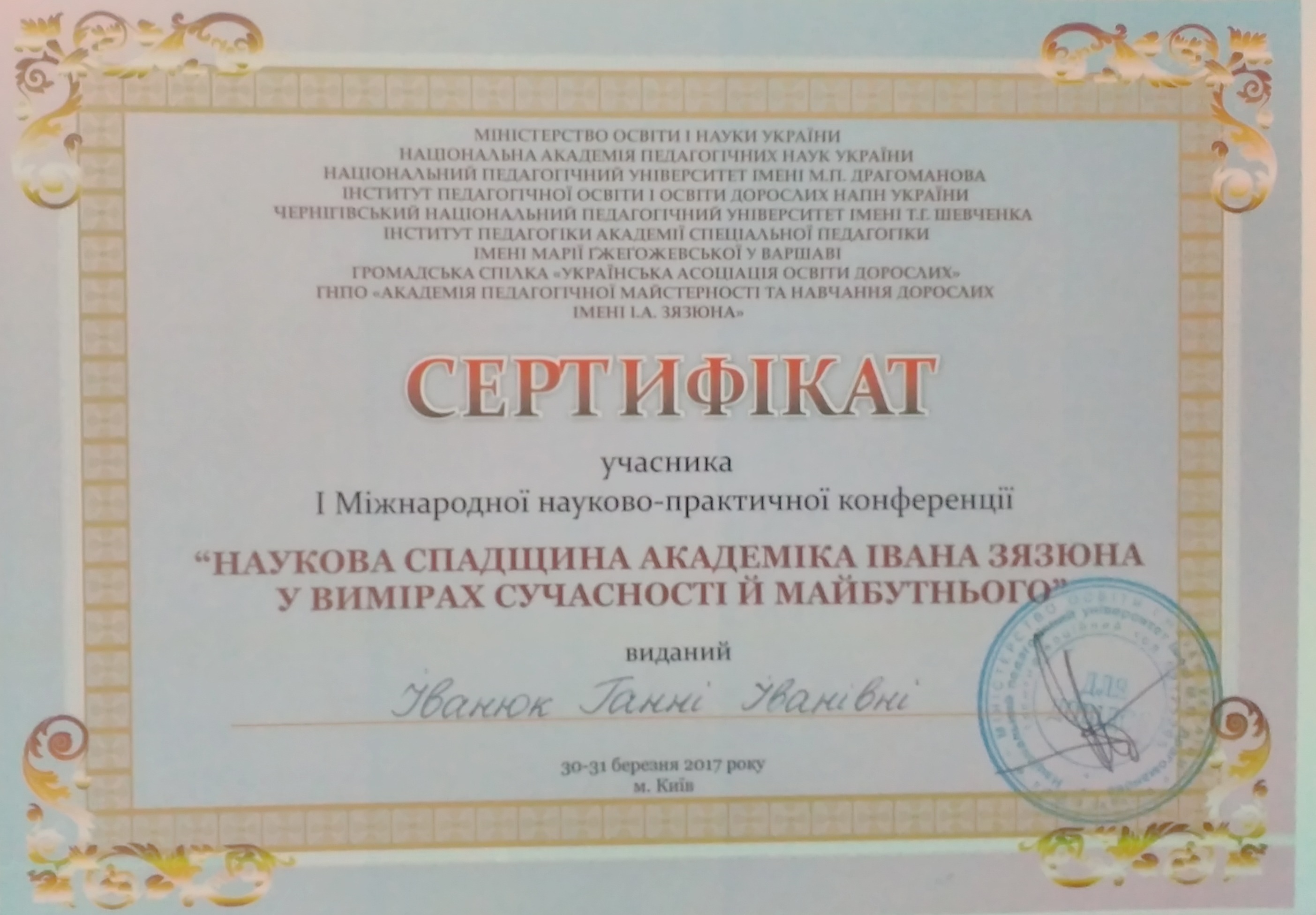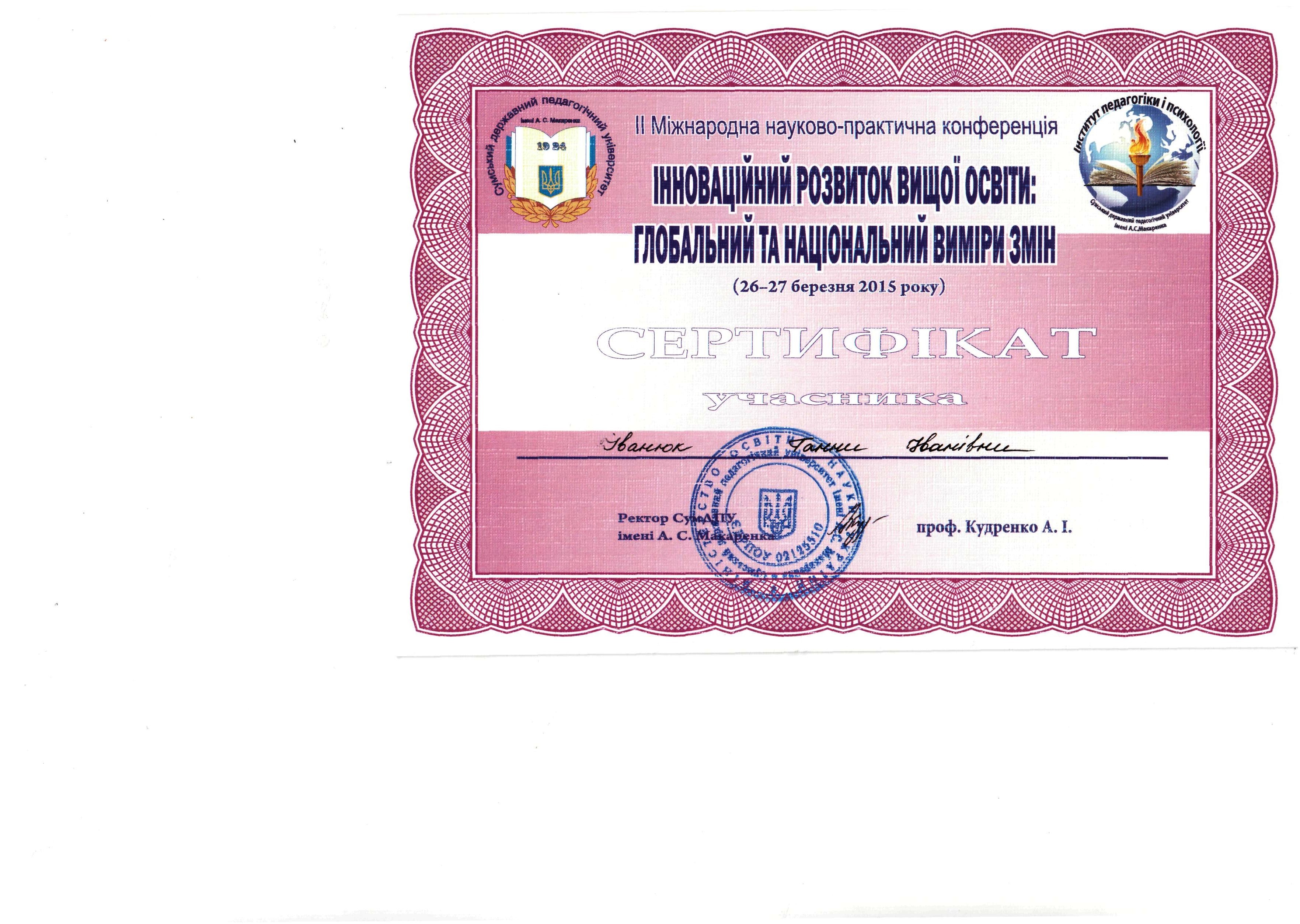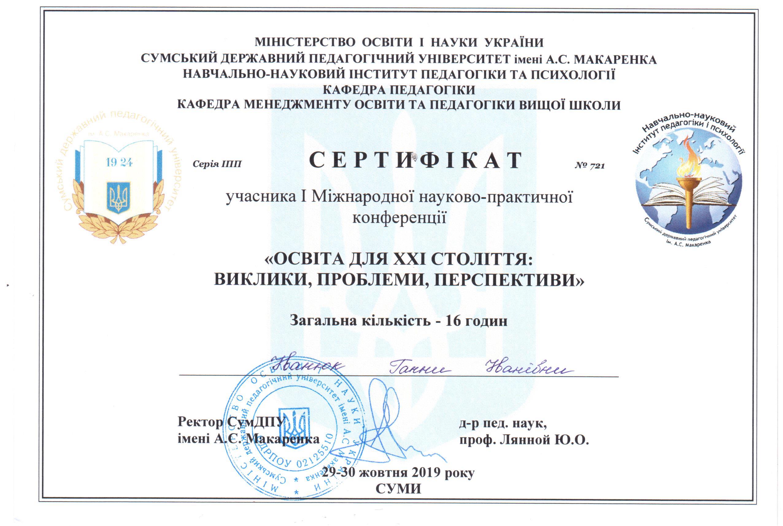 | 1645 | Перша Міжнародна науково-практична онлайн Інтернет-конференція "Модернізація освітнього середовища: проблеми та перспективи" | Нова стратегія розвитку освітнього середовища вищого навчального закалду | м. Умань |